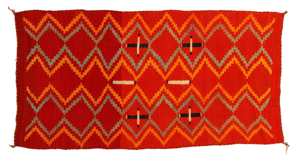 Navajo Child's Blanket. 4'4" x 2'3" hand woven from all native handspun churro wool. A nice serape style child's blanket with vertical rows of terraced meanders forming three rows of red diamonds. Shiny blue indigo and white crosses adorn the middle areas. The light blue terraced meanders are indigo as well. Circa 1885. (est. 3,000-5,000). CONDITION REPORTS: www.auctioninsantafe.com/docs/cr2012.pdf