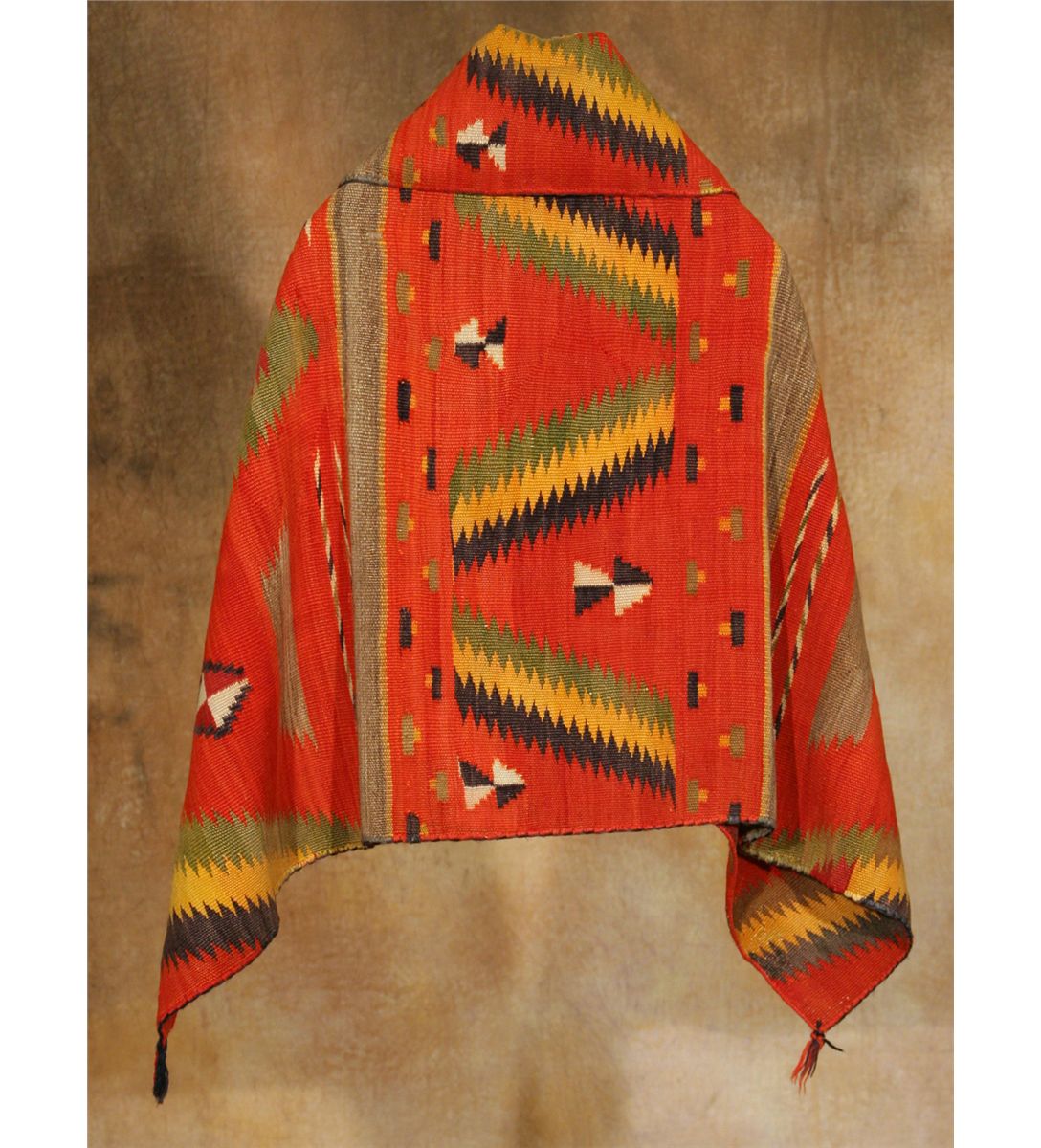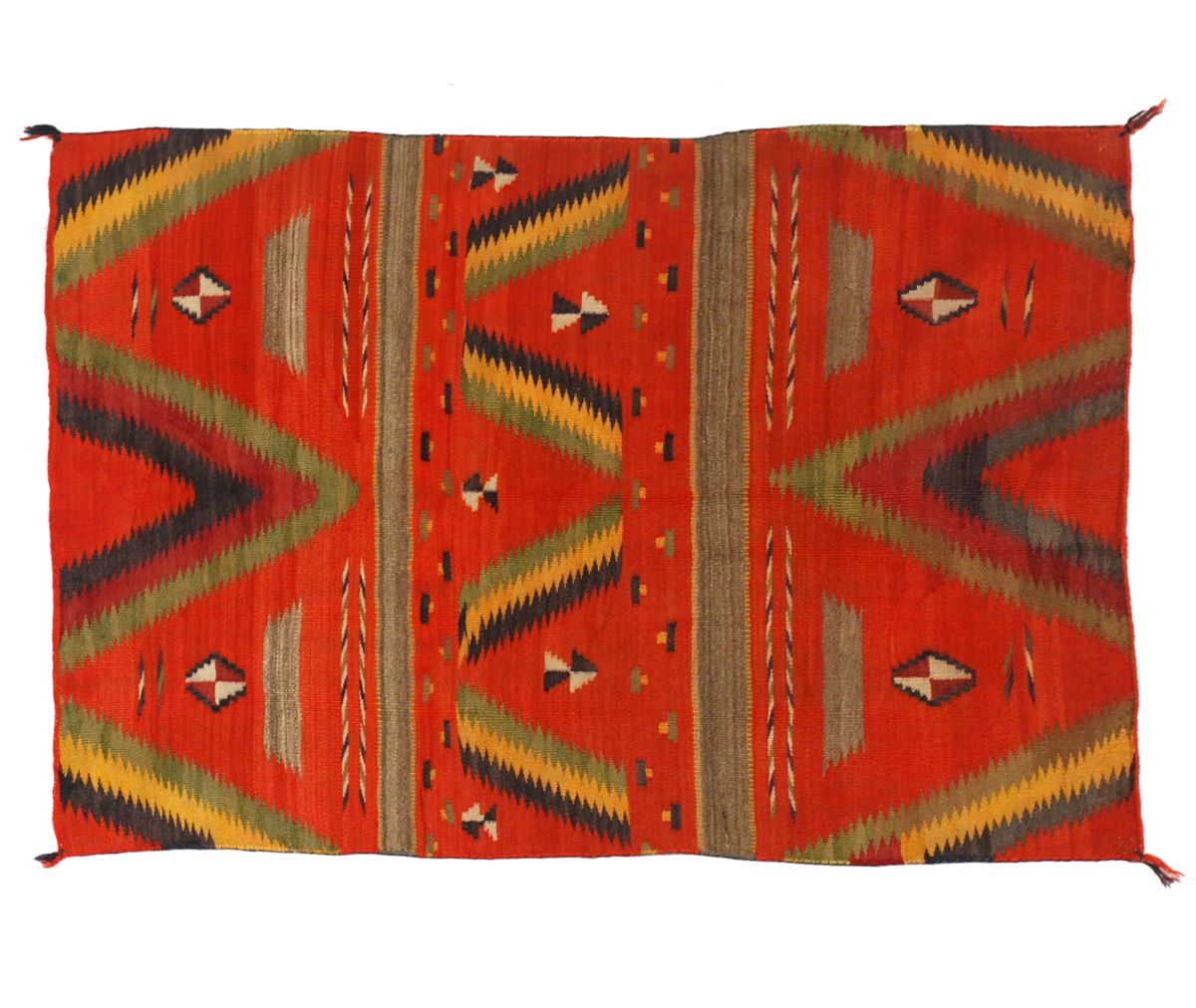 Navajo Child's Wearing Blanket. 3'8" x 2'6". Three panel serape design, woven from silky, long Churro sheep wool. A very colorful old blanket with numerous small floating motifs. Circa 1880s. A treasure!
