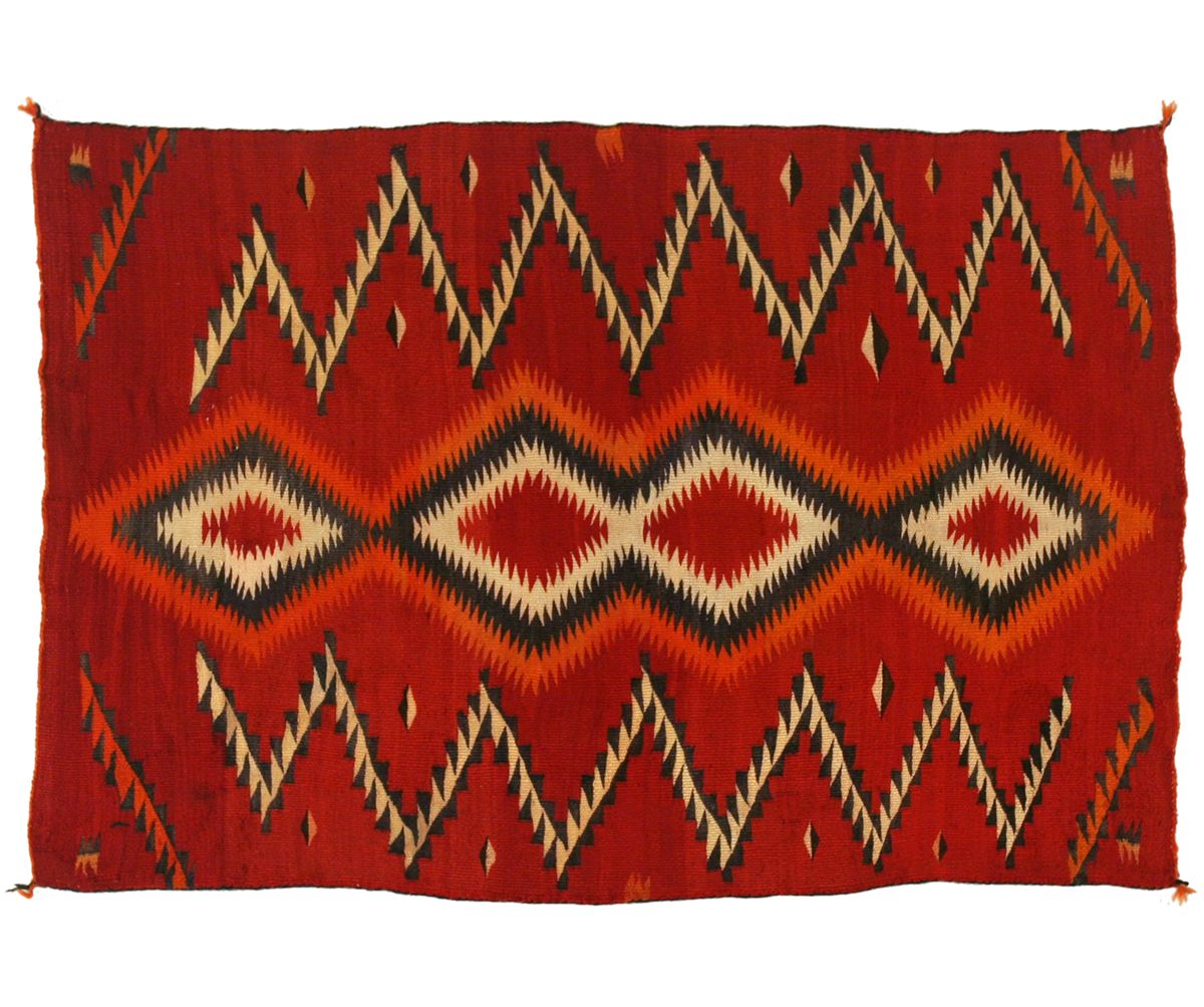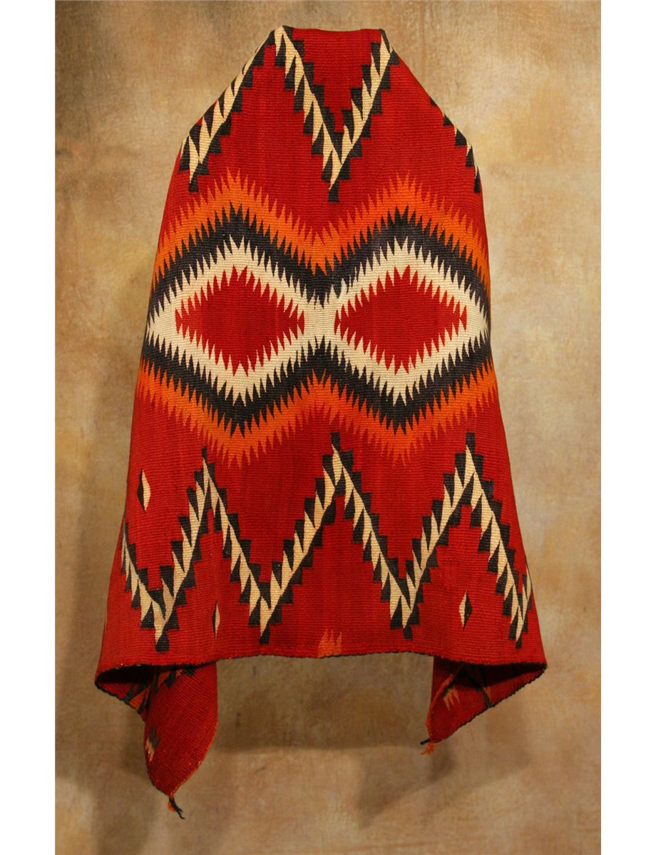 Navajo Child's Wearing Blanket. 4'2" x 2'10". Beautiful red background. The fine serrated diamonds down the vertical axis are flanked with lightning zigzags. Woven from silky, long Churro sheep wool. Circa 1885-1895.