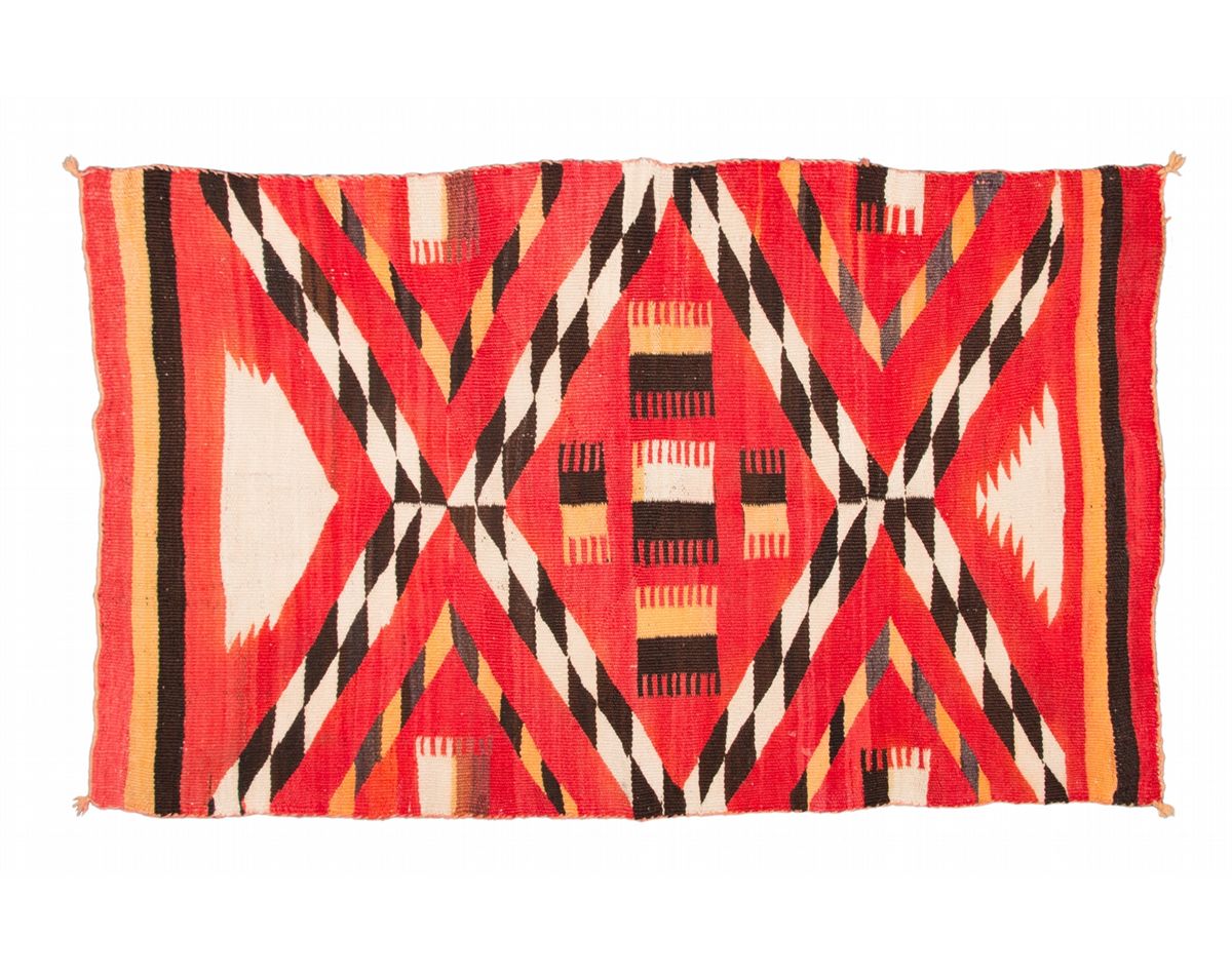 Navajo Child's Wearing Blanket. 4'6" x 2'8". A nice transitional era weaving, from all native hand shorn and hand dyed, long, staple Churro sheep wools. The design has a number of weaver's comb motifs along with a bold black and white diamond layout. Circa 1890's.
