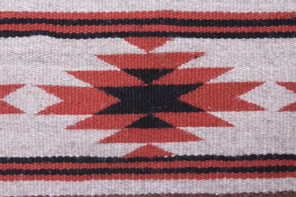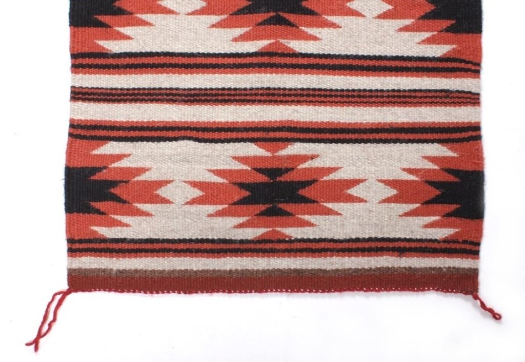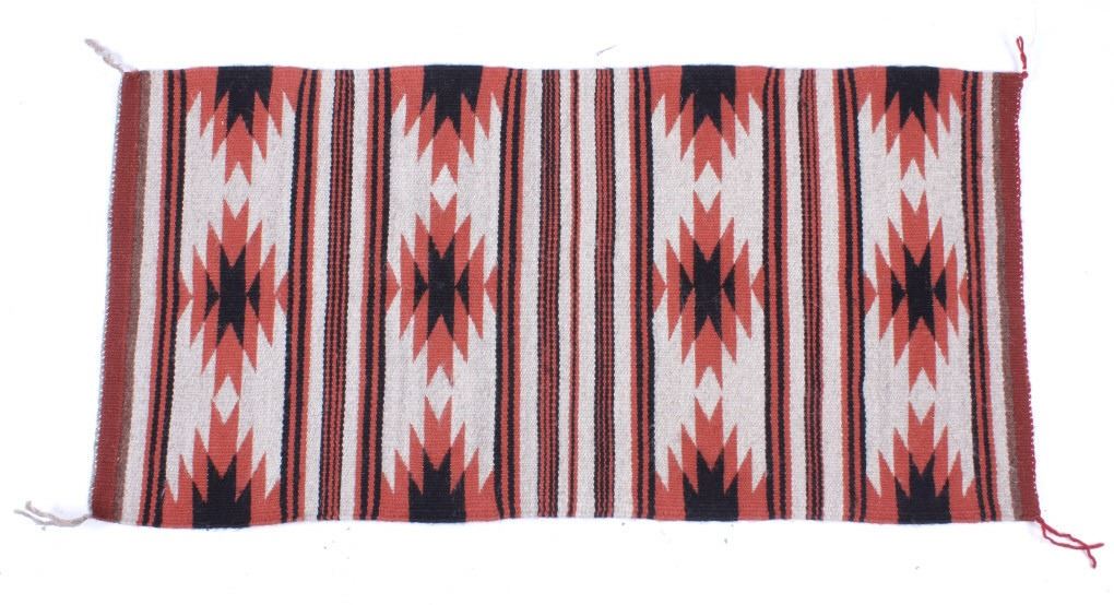 For your consideration is this small Native American Navajo Chinle pattern rug. The rug features black and rust colored Chinle stars on a beige field with those colors repeated in the banded sections separating the Chinle Stars. Beige or red tassels are at each corner of this rug. The rug is in excellent condition with tight weaving and good color. It measures 37 1/2" X 19".
