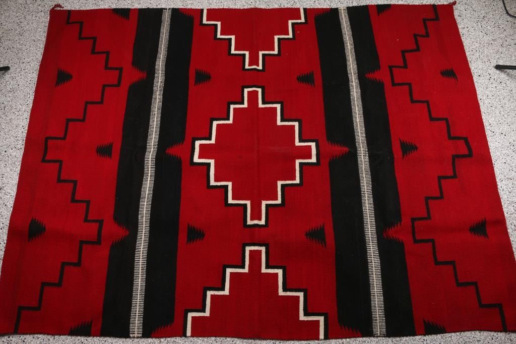 Bright red base, with center geometric patterns in black and white. Includes Camillo Garcia trading post tag. 61 x 82". In very good condition. No condition issues. From the Steve Goldstein Collection, Scottsdale, AZ.