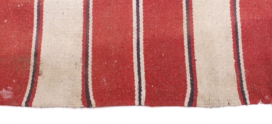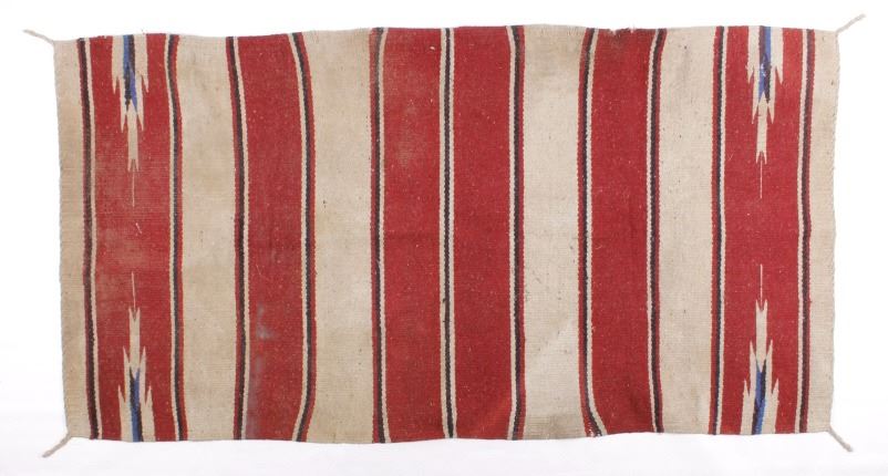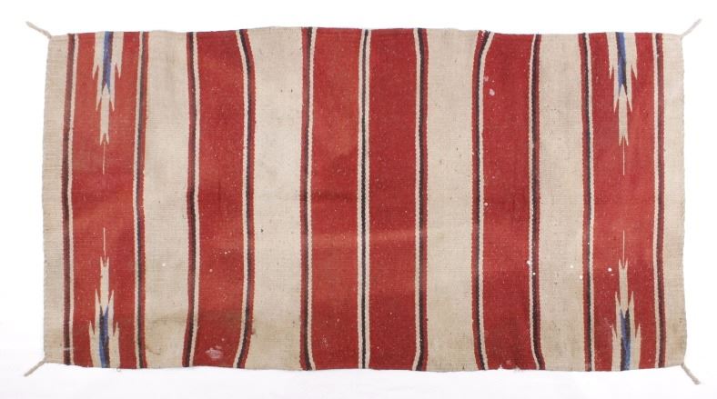 This lot includes a Navajo Native American Indian, Chinle style wool rug. The rug shows typical Chinle pattern of repeating horizontal bands of red, off-white, and black. at each corner of the rug, you can see polychrome Chinle stars, with black and blue accents. The rug shows fair condition overall - It still shows a tight weave, but has slight staining. The rug measures 57 1/4" long, and 29 1/4" wide.