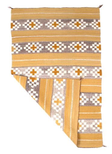 For your bidding pleasure is this Navajo Native American Chinle Wide Ruins Rug. With extravagant history in America, Chinle rugs had a huge impact for the native Navajo weaving culture by trader Cozy McSparron and Bostonian Mary Cabot Wheelwright. Visually stunning with beautiful, contrasting vegetal colors, these designs are generally steeped in vibrant greens, muted golds and tans, and soft ivory and pink. The use of these unique colors as well as the intricate detail allow for striking color palettes, remarkable designs, and truly exceptional art work. This rug shows its gold with interwoven white and a dry gray. It is tightly woven as well as being a think weave it has all four of its tassels intact. The measurements of this rug are 62" x 39".