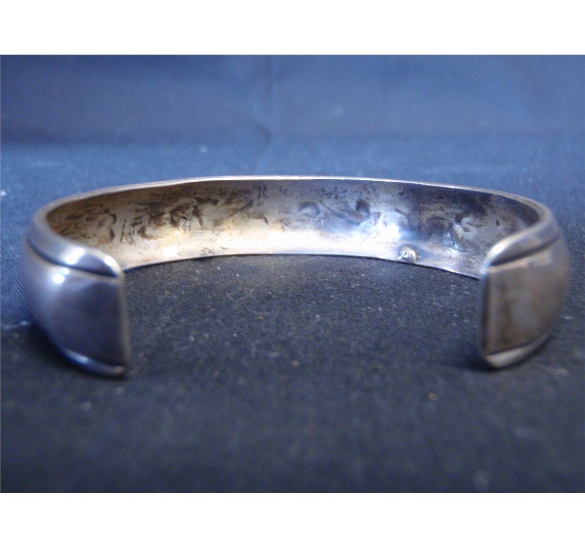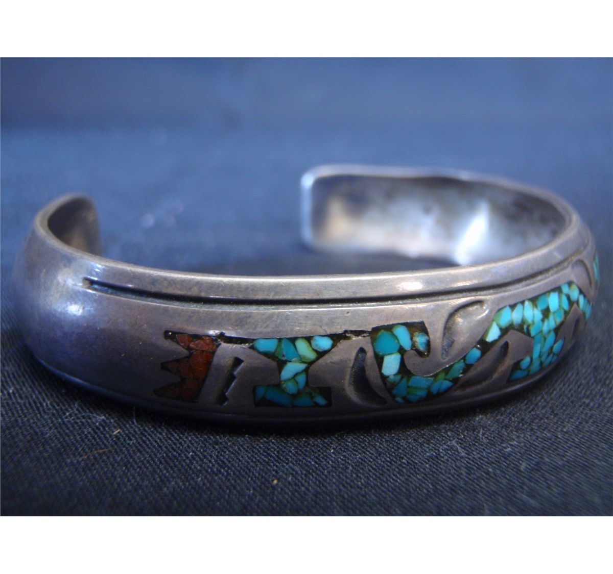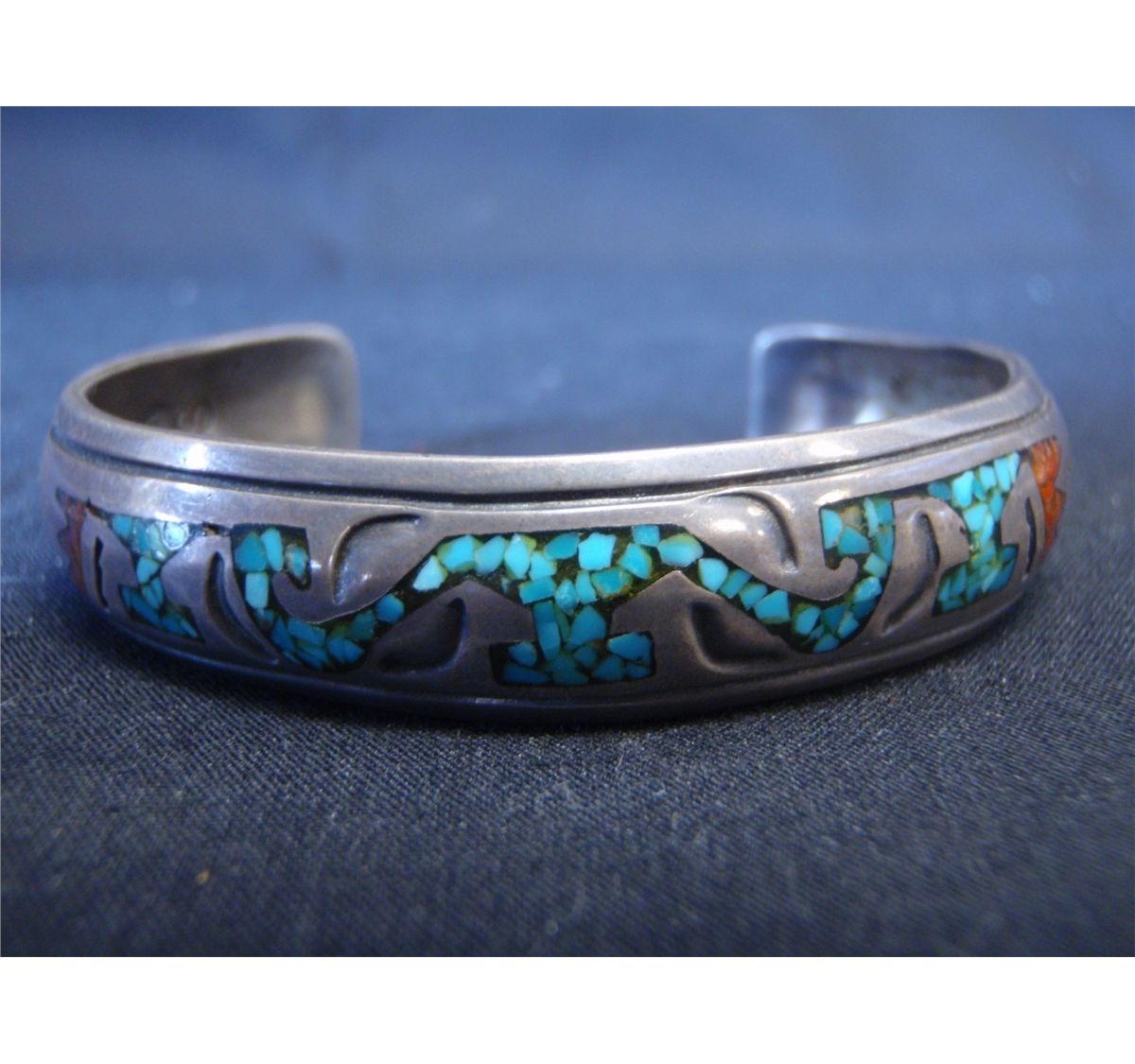 Half inch chip inlay Navajo bracelet. Made by Tommy Singer. Signed "S (With a crescent)" Ca. 1970's Measures: 5 1/4" internal circumference + 1 1/4" gap (where the wrist enters) Shipping on this lot: $10.00. Additional Shipping Charges for Lots sent outside of the U.S