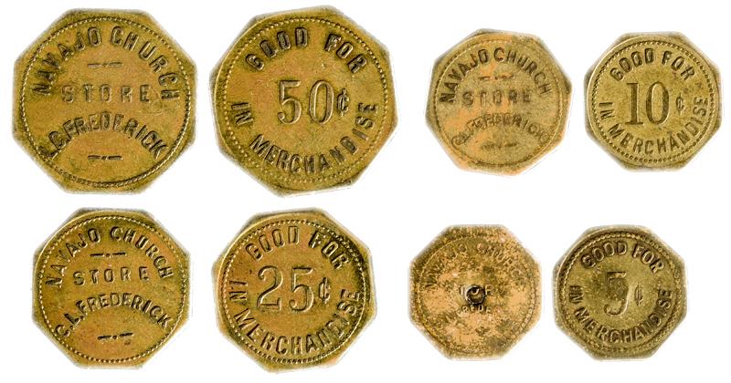 Lot of four tokens: Obverse: Navajo Church / Store / C.L. Frederick; reverse: Good For / 5,10,25,50 / In Merchandise. Br, all oc, 21,22,24,28mm, R10. Very good to very fine condition. 5 cent token is unlisted. 25 cent and 50 cent are R10.