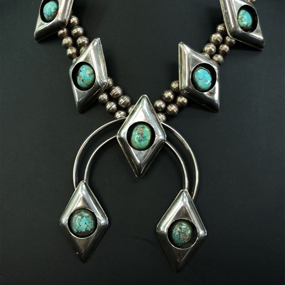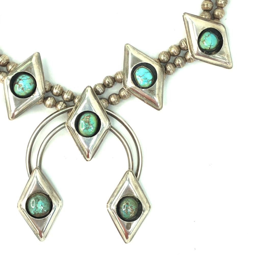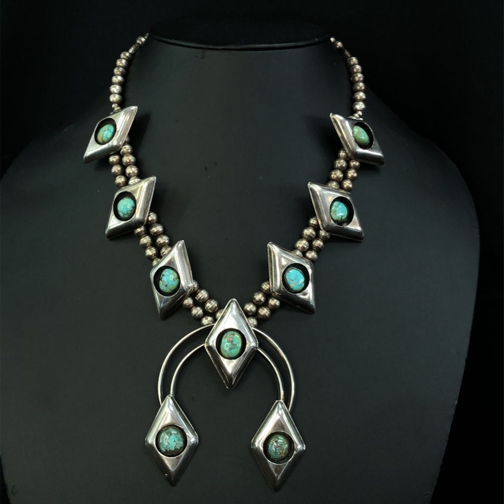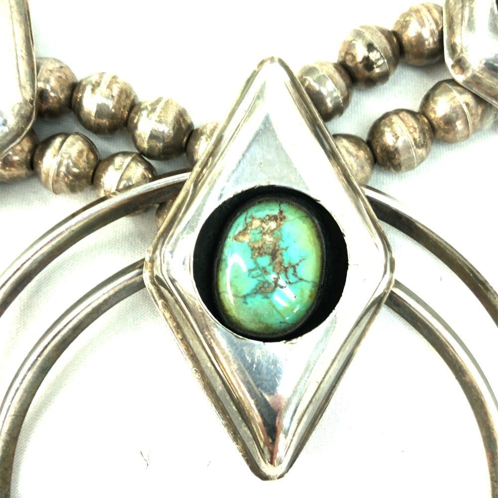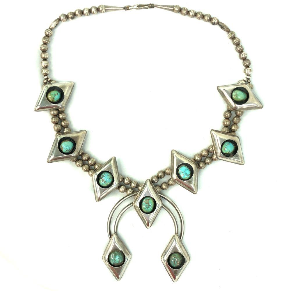 Native American circa 1950 Navajo shadow box design squash blossom necklace with 9 oval Royston turquoise stones 6 blossoms 1 3/4 "x 1" Naja L3"3/4 " W 3" strung on 7 mm hand made Navajo pearls OAL 28" necklace 20"