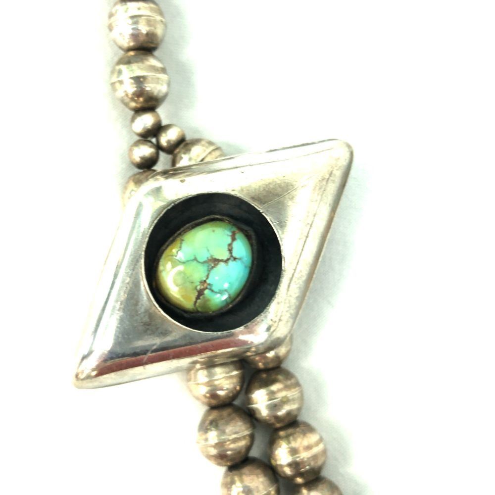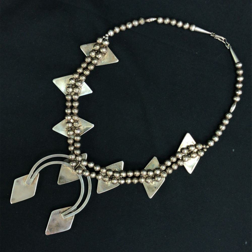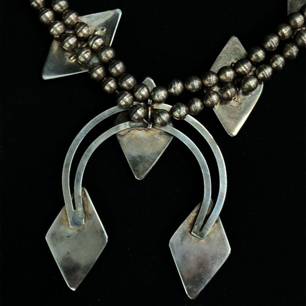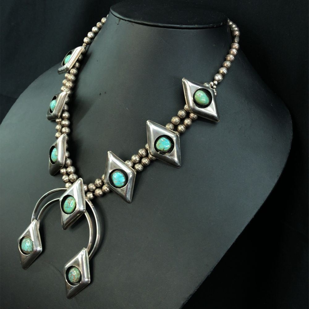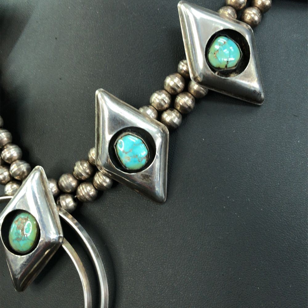 Native American circa 1950 Navajo shadow box design squash blossom necklace with 9 oval Royston turquoise stones 6 blossoms 1 3/4 "x 1" Naja L3"3/4 " W 3" strung on 7 mm hand made Navajo pearls OAL 28" necklace 20"