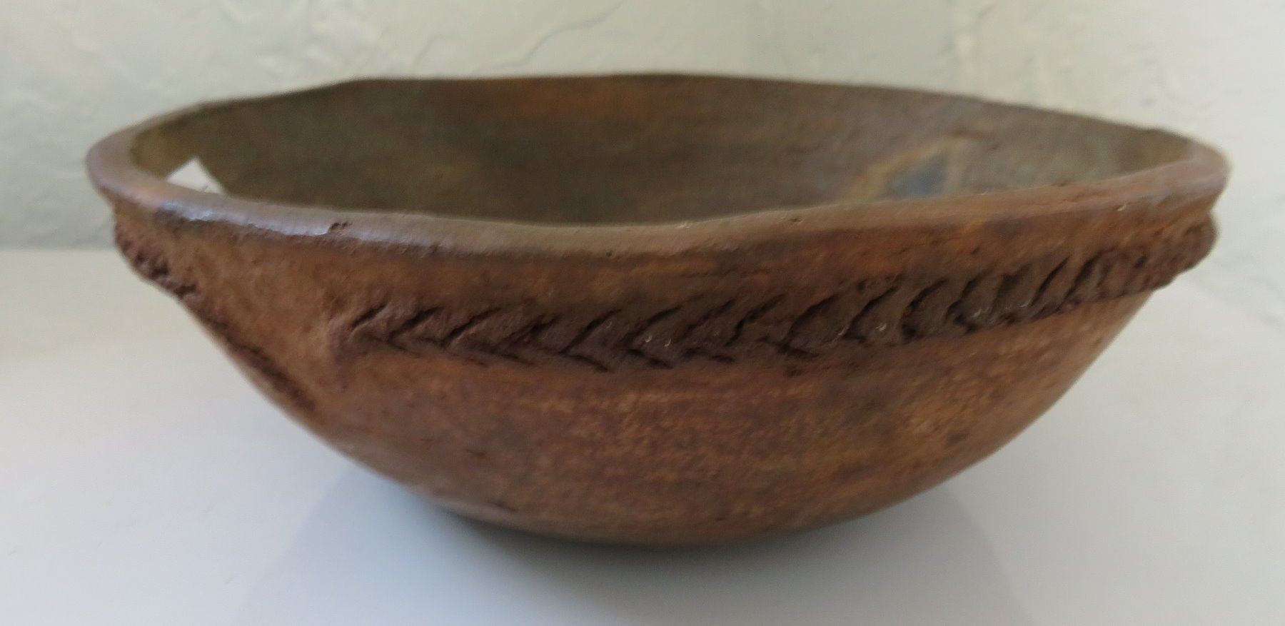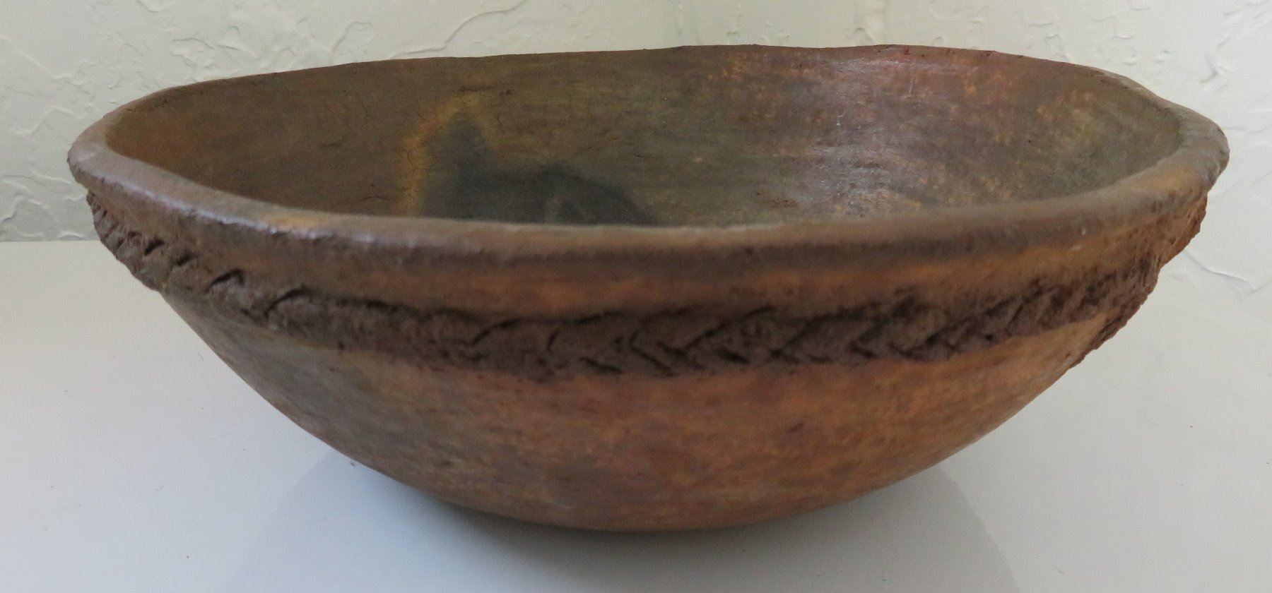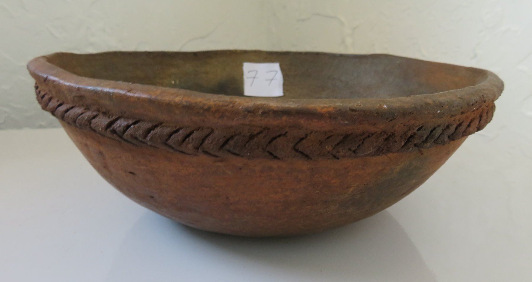 Navajo Clay Bowl, c. 1950s. Made of clay, the item measures 8 3/4" x 3". New Mexico. Condition: Good, some wear, see images. Shipping: $24.50 w/insurance and signature, due to weight.