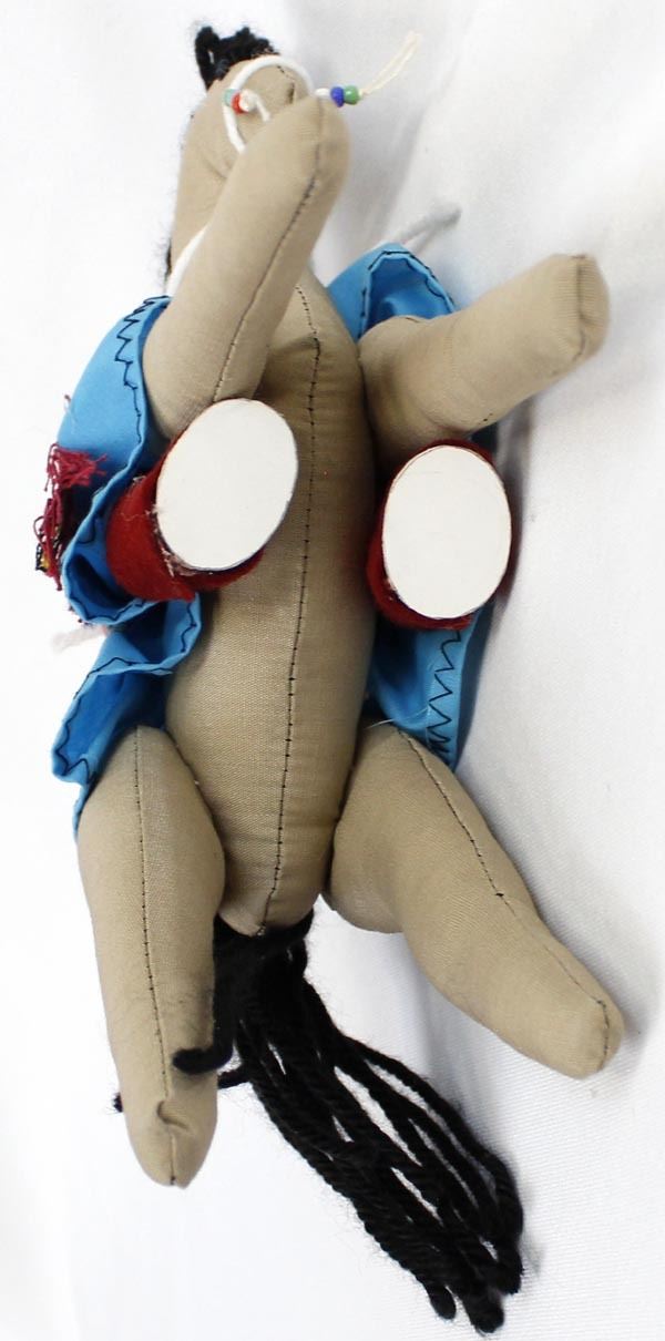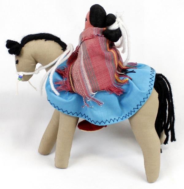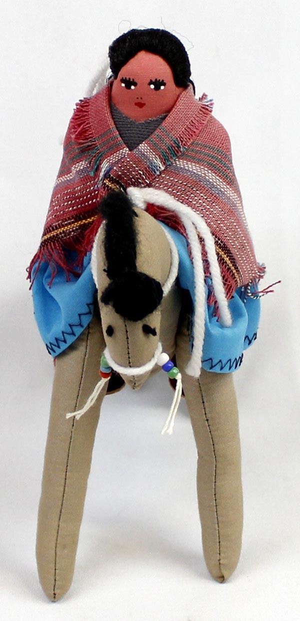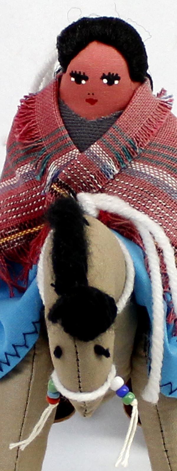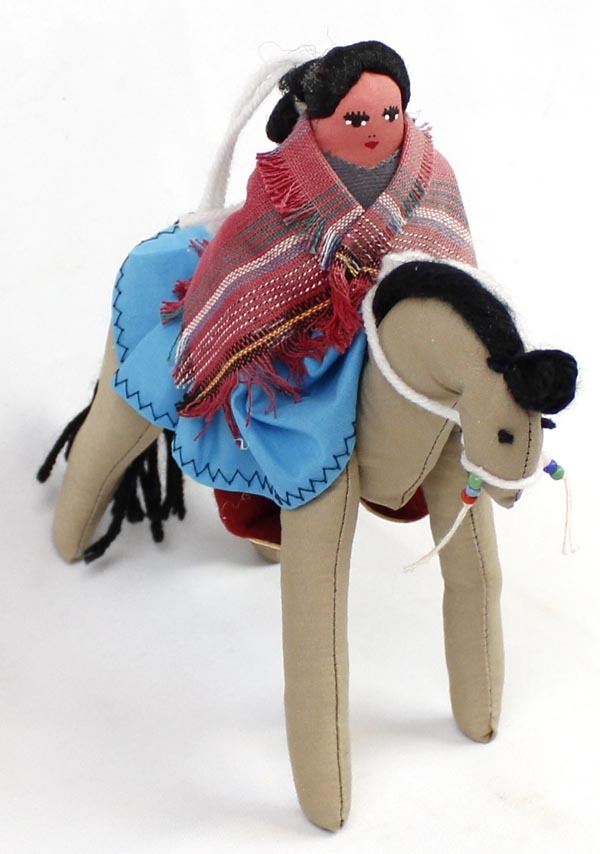 Native American Navajo Cloth Doll on Horse by Ruth Apachito, measures 3" x 8" x 9", embellished with yarn and beads, hand painted face