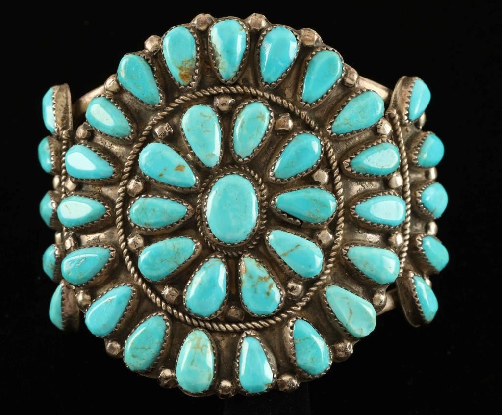 Large 2 3/4" cluster of turquoise set in sterling silver with an arc of five turquoise stones on each side.