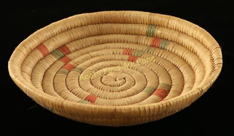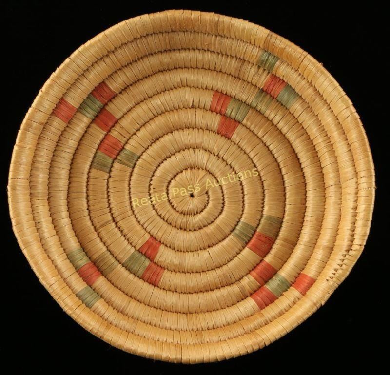 Small coil basket with green and red accents. Measures 6 1/2" dia. 1 1/4"h. Good condiiton