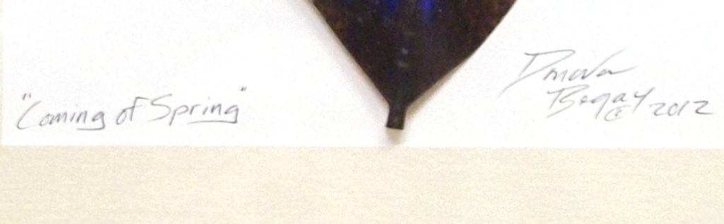 Painting is titled "Coming of Spring". Frame measures 16-1/2" tall by 13-1/2" wide. Feather measures 9" tall by 3-1/2" wide.