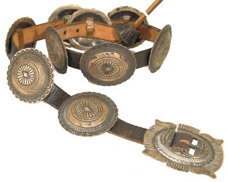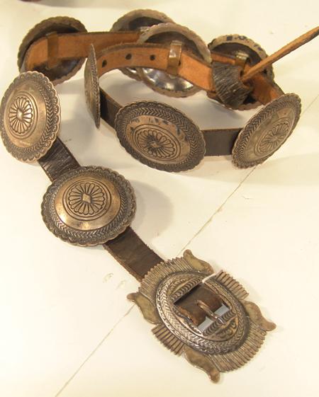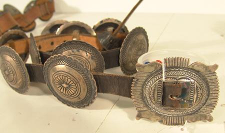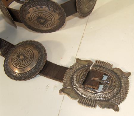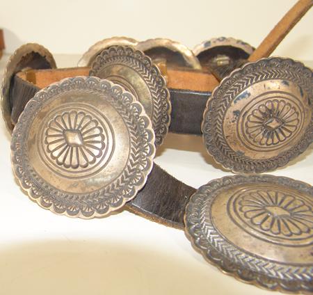 Beautiful, vintage, hand stamped all-silver repoussé belt with nine round conchos and matching spider buckle - signed. Condition: very good. 40" x 3"
