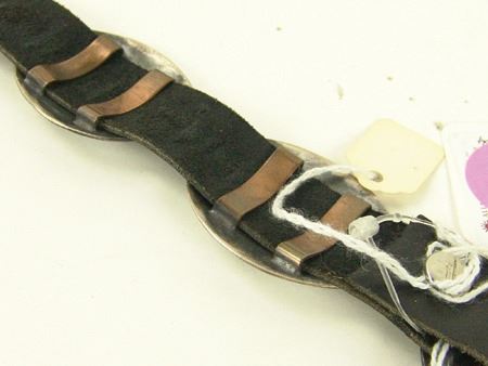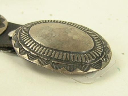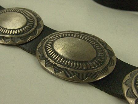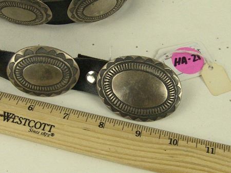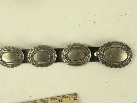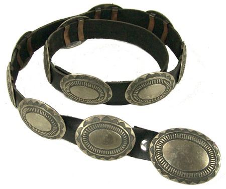 Ca. 1975, Traditional hand stamped all-silver ladies' belt with 11 matching conchos plus a buckle that is slightly larger. Very good condition, nice patina, adjustable size, signed "C." 28" x 32" waist, buckle 1-3/4" x 2-1/2"