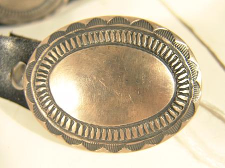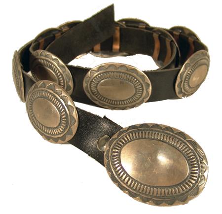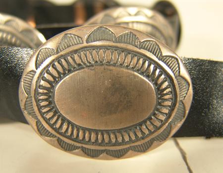 Beautiful hand stamped all-silver belt with 11 matching oval conchos and matching buckle - signed "C". Condition: excellent. 41" x 1-1/2" (26-36" waist) * will fit through belt loops