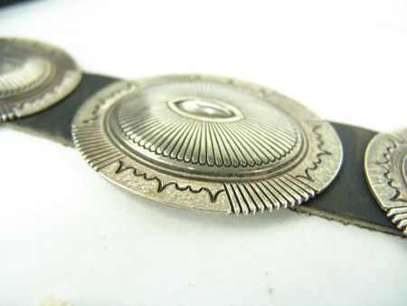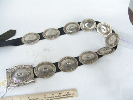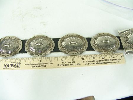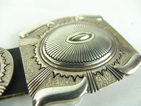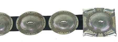 Ca. 1980s, Fantastic hand wrought all-silver concho belt done in exquisite detail with matching (3" x 3-1/2") buckle. Very good condition, a masterpiece! Retail $1950. 56" x 1-1/2", conchos 2-1/2" x 3"