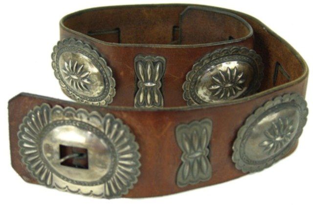 Navajo Concho Belt Navajo Concho Belt, Classic, hand stamped, traditional repoussé silver concho belt with wide leather belt. Very good condition, nice patina. Circa: Ca. 1950s Size: 36" x 2-3/4"