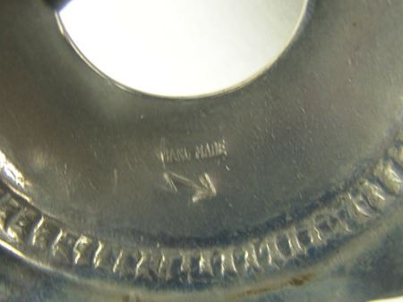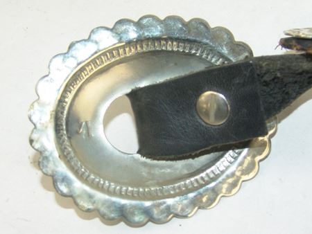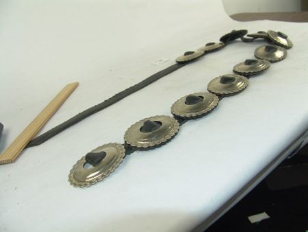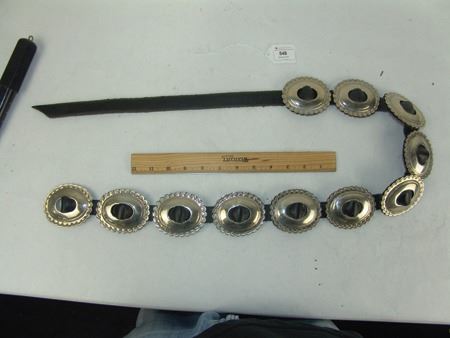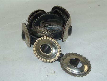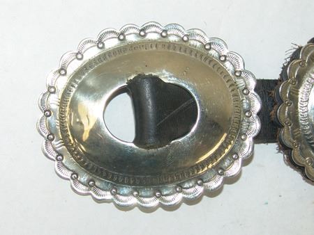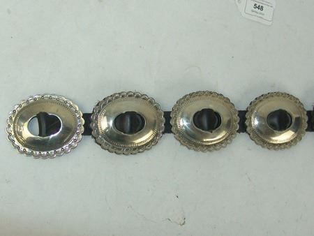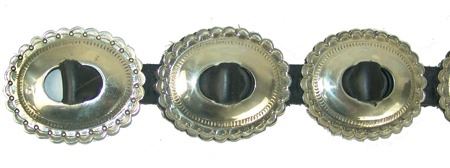 Ca. 1980s, Classic, hand stamped, 11-piece, all-silver leather-backed concho belt, done in the early convex oval style. Very good condition, marked "handmade" with a downward pointing arrow. 51" long, conchos 3" x 2-1/2"