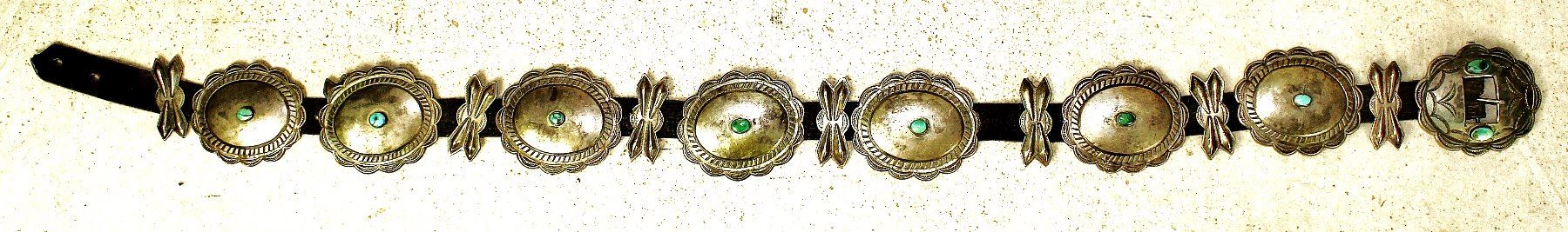 Eye catching 1940's silver concho belt with scalloped oval conchos measuring 2 3/4" and decorated with turquoise stones and alternate with silver butterflies measuring 33".