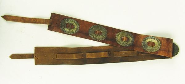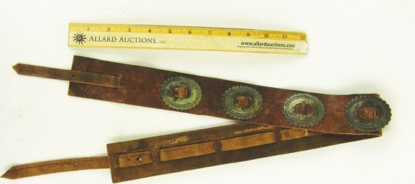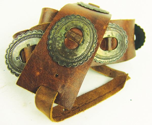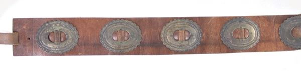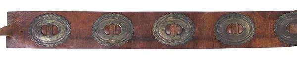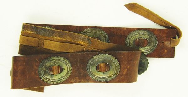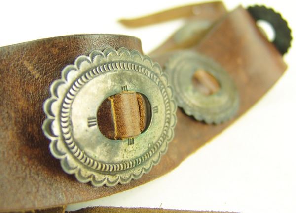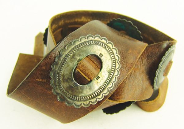 Classic, early version of a hand stamped, all silver concho belt with eight, matching 1-1/2" x 2-1/2" oval concho on a nice 2" wide leather belt. Very good condition, great patina.Early/Mid 1900s31"