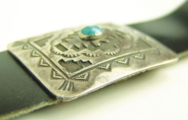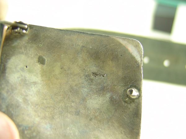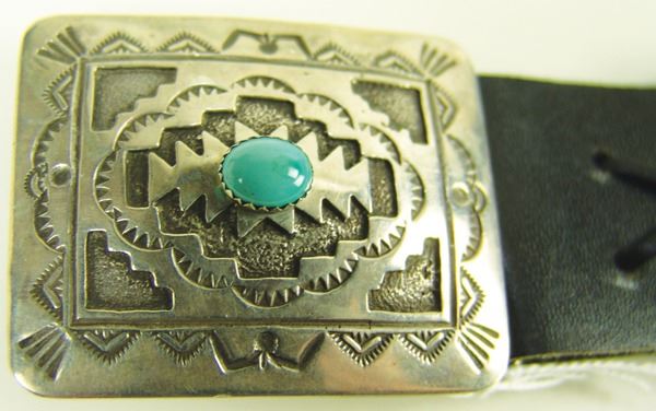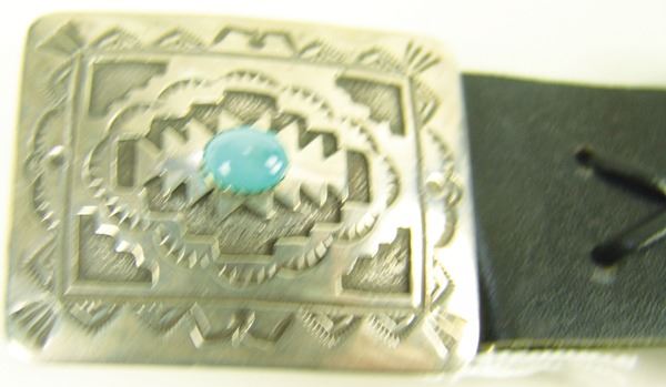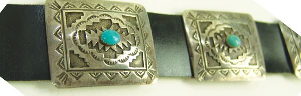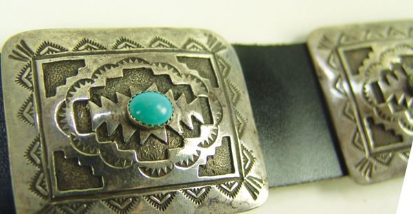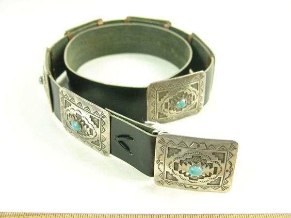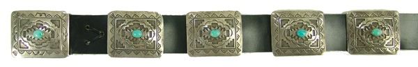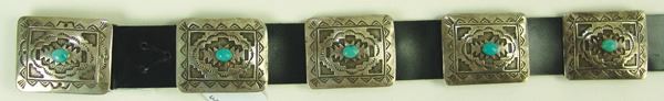 Choice, hand wrought, silver on silver overlay concho belt the six, 1-7/8" x 2-3/8"rectangular conchos and matching buckle done in unique "Navajo Rug" design. Very good condition.Ca. 1980s26-36"
