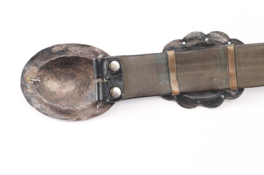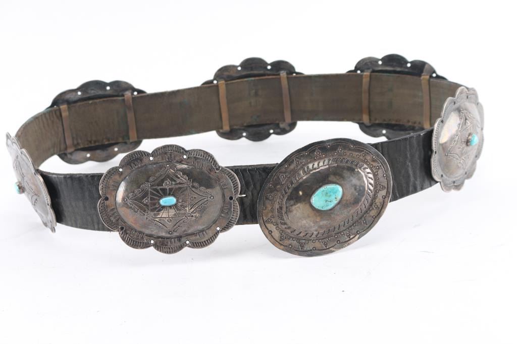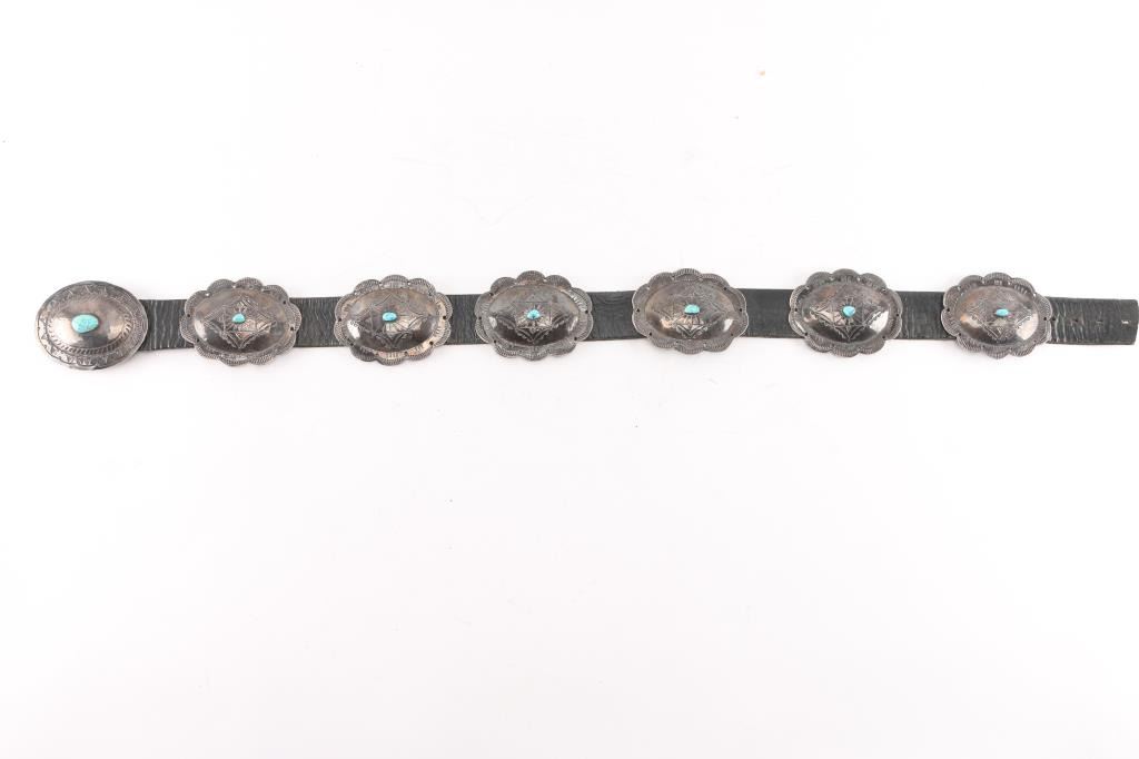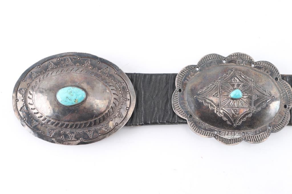 Large conchos with single turquoise stone very heavy sterling silver on black belt 36" end to end. From the Barry Erickson collection.