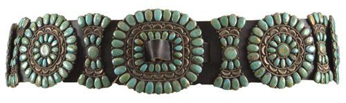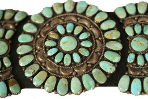 Navajo Concho Belt. Eight 3" round conchos with fine turquoise set in silver. Nine butterflies and matching buckle. 3 1/2" x 3 1/4". Made by Julieanna Begay. All excellent condition and very showy. (est $3,000-4,000)