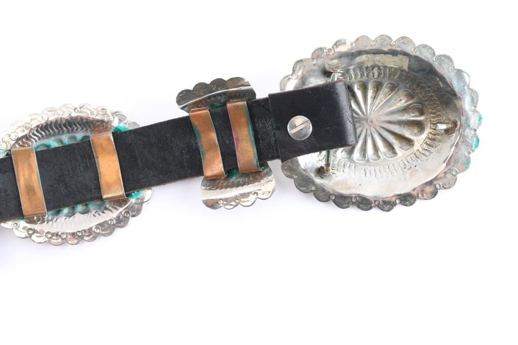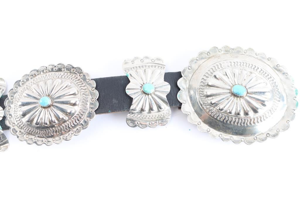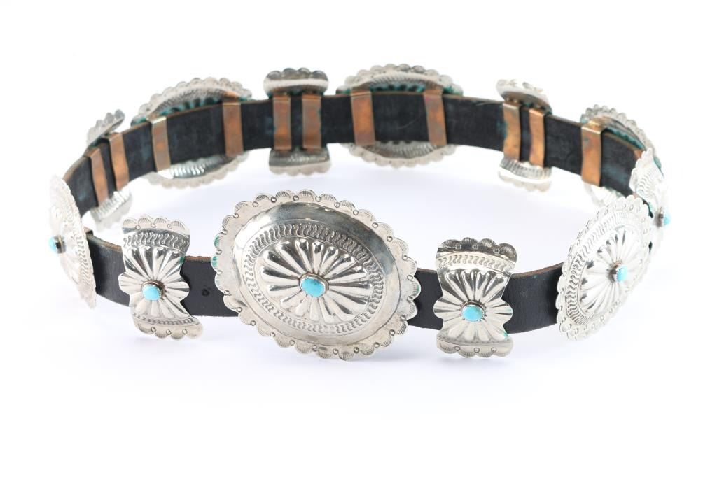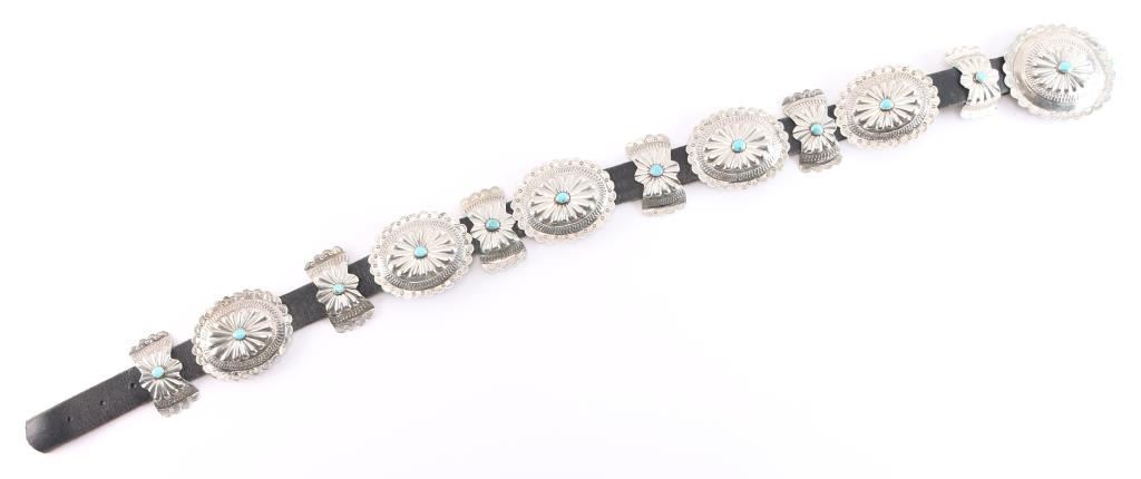 With 12 traditional conchos, oval and butterfly, accented with single turquoise stones. Measures 35" end to end, mounted on brown leather belt. Set in German silver.