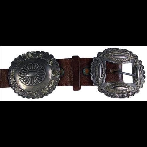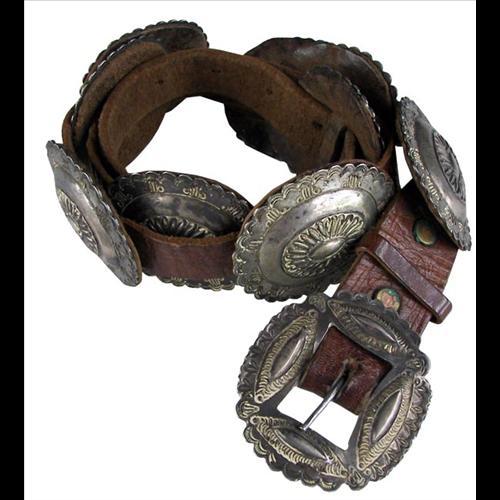 Navajo Concho Belt, 9 Silver Conchos plus Buckle, 36" belt length, 2 1/4" concho length, Provenance: From the Estate of Charles Ragland Bunnell