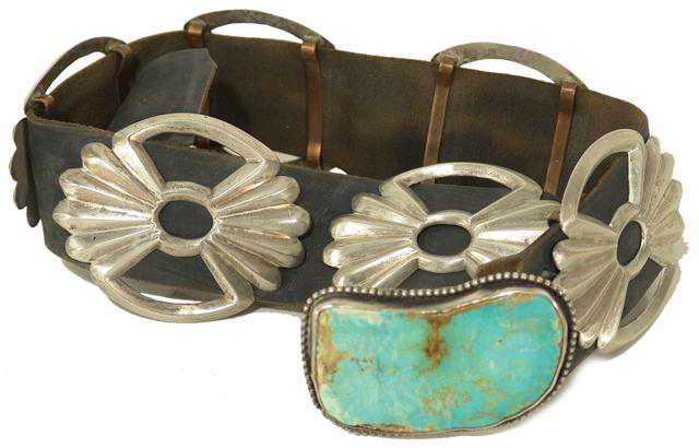 Early 1970s, Beautiful leather belt with huge turquoise cabochon buckle and eight sand cast silver conchos. Belt 32" x 1-3/8", buckle 2" x 3-1/4", conchos 3" x 3-1/2"