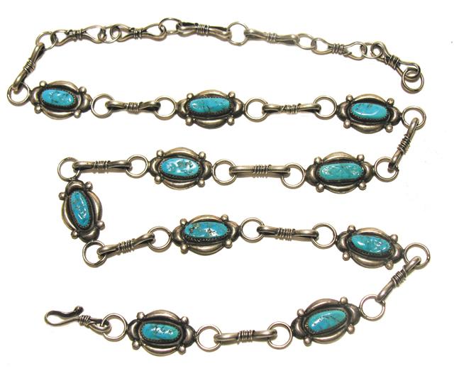Circa 1970s, Superb concho belt with ten natural turquoise and silver conchos and heavy links. 35"