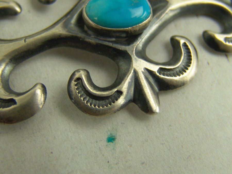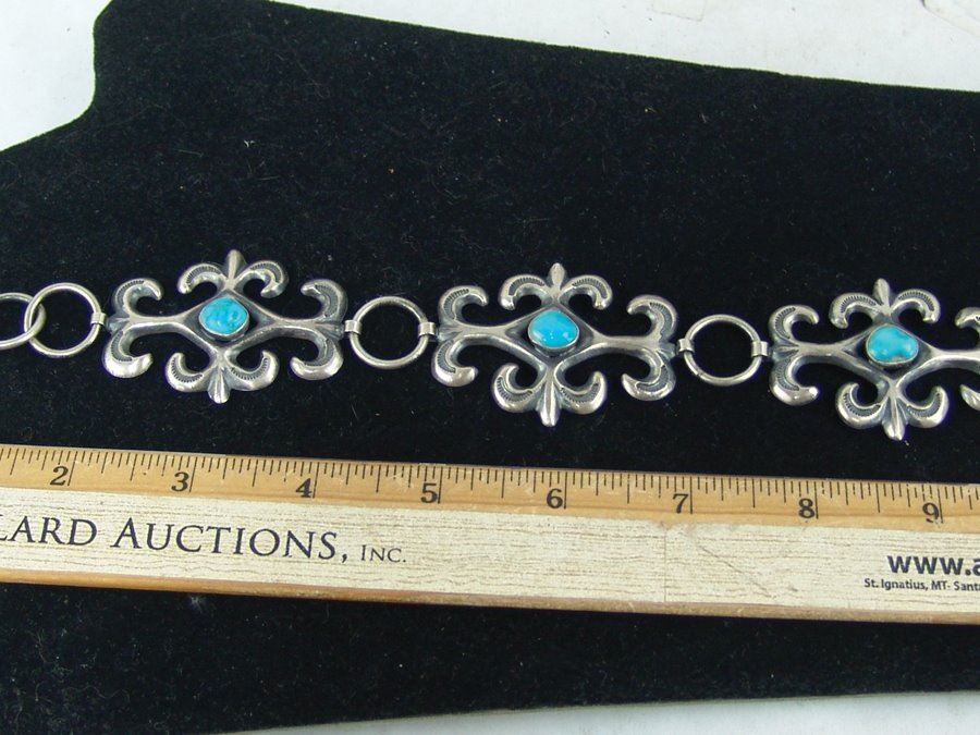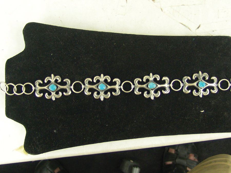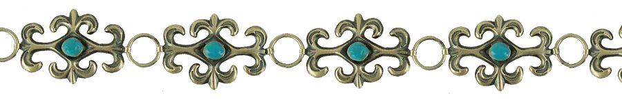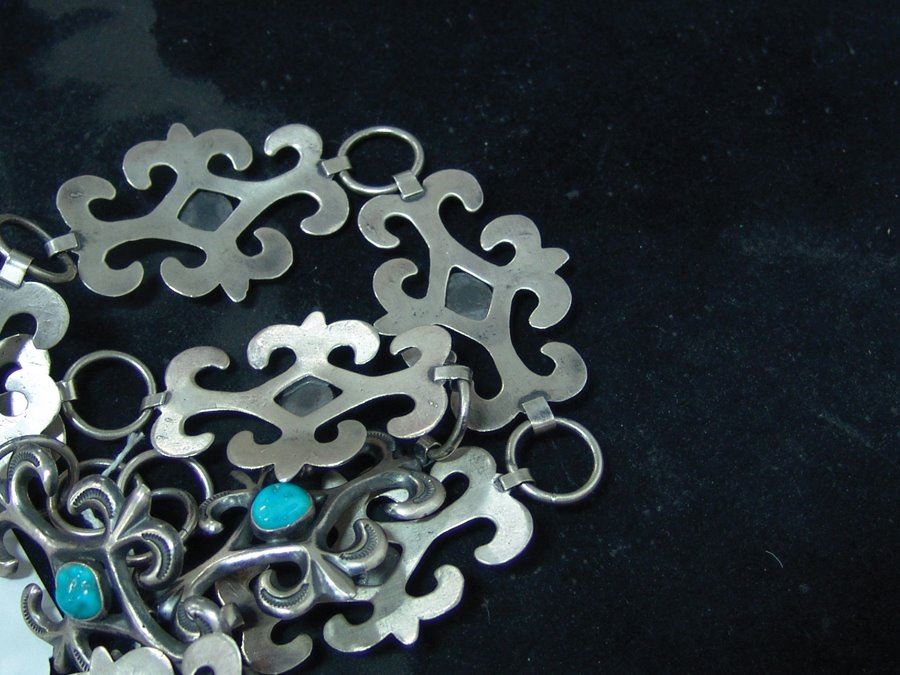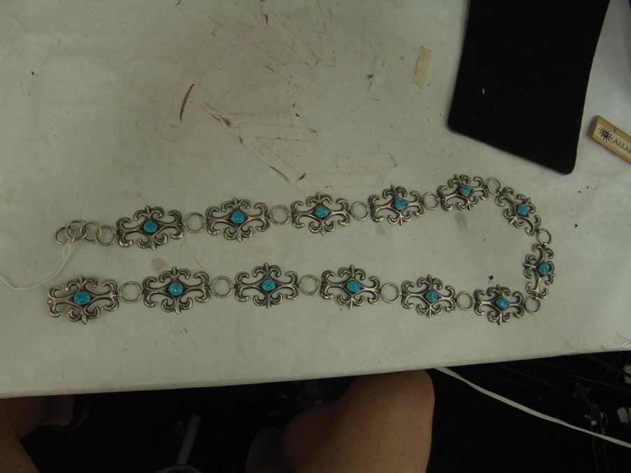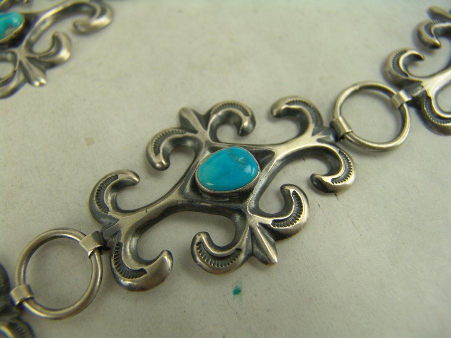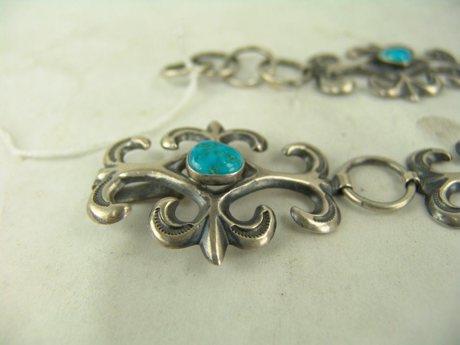 Beautiful 1-1/2 " wide ladies sand cast all silver concho belt done in fleur de lis style with stamped accents, each segment and buckle with a single turquoise stone. Very good condition.,,Adjustable to 34"