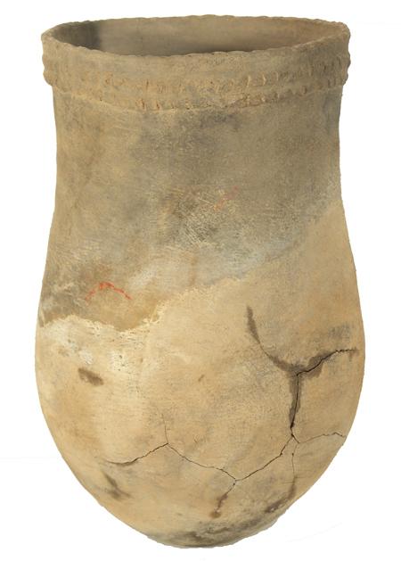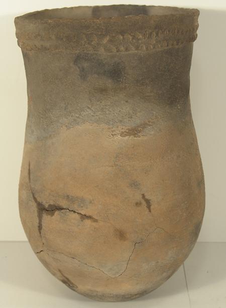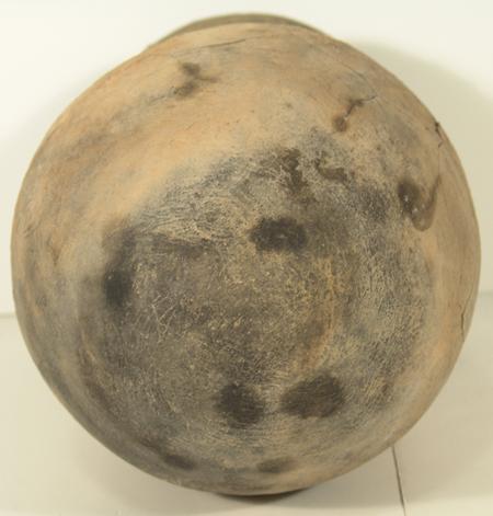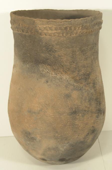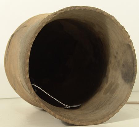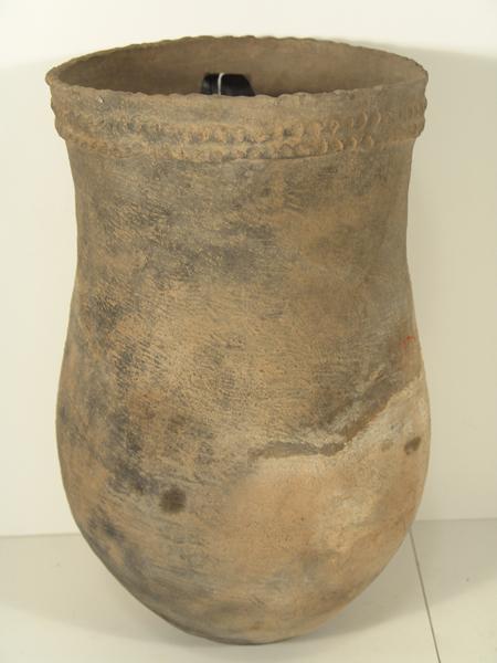 Large coiled gray clay vessel with bullet shaped bottom, fire blackened spots, and fillet of clay around the neck. Provenance says Governador Canyon. Purchased from Turney in 1964 for $100; appraisal value $950. Some restoration. 15" high x 9" diameter
