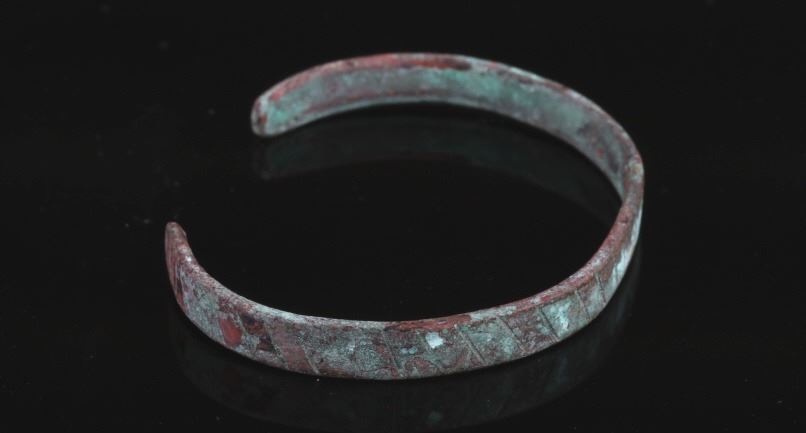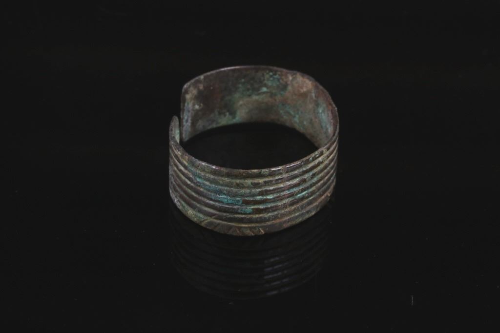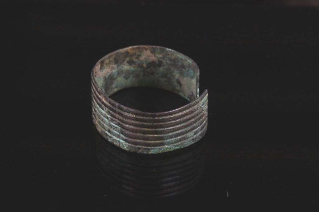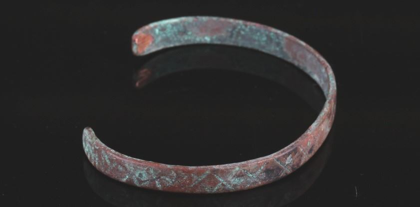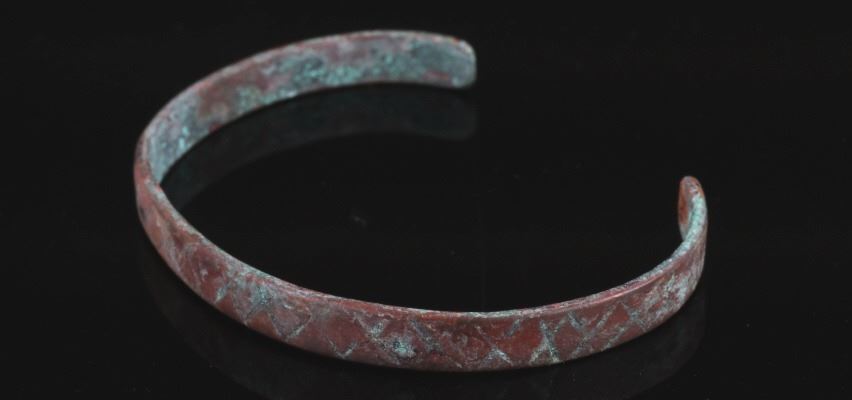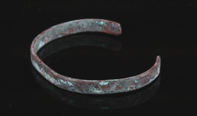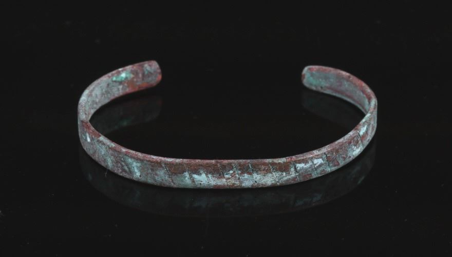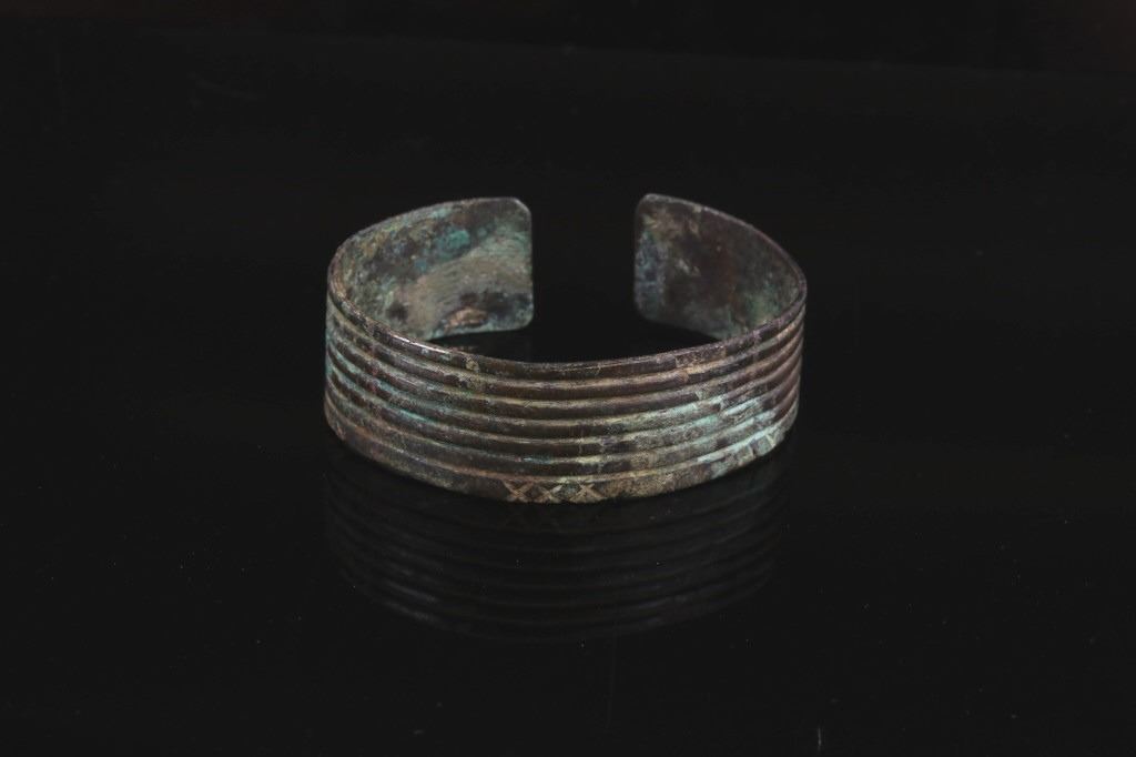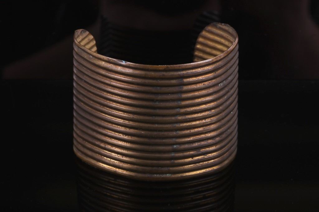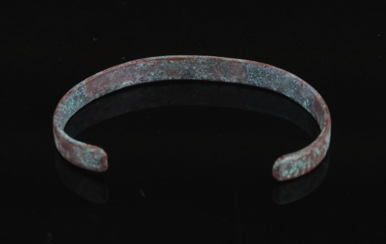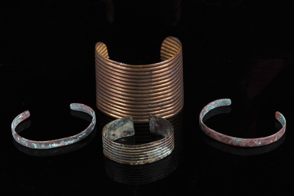 The lot features a collection of four original 19th to 20th Century Navajo Native American Indian copper and bronze trade bracelets. The bracelets include a large bronze bracelet with corrugated like striations. The next three all appear to be copper with two having a hand engraved tooled design and the third having a hand engraved corrugated like striation design all being of a heavier construction. Provenance: From the renowned Sundog Fine Art Bozeman, Montana collection and collected by Bruce VanLandingham. Bruce VanLandingham was a pillar in the American Indian collecting community and a respected expert. Along with being an avid collector Bruce also was the sole owner of Sundog Fine Art in Bozeman which was both part museum and gallery. The largest bracelet measures 2”W by 2 5/8” across from side to side by 2.25”H from opening to top. The bracelet has a 7.5” inside circumference wrist size including the opening.