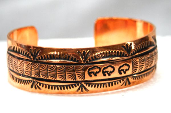 Navajo Copper Cuff Bracelet, signed by Vera Tsosie. Traditional Navajo stamping with 3 buffalo figures in the center. Inside measurement is 6 5/8'' x 3/4''. Mark is stamped ''VT''.