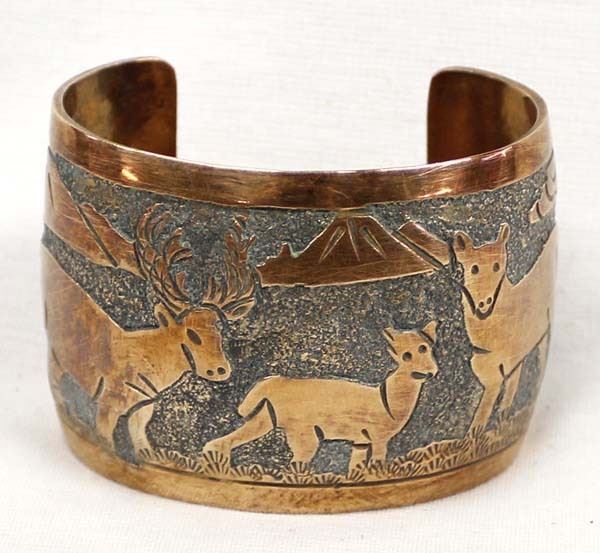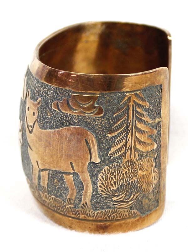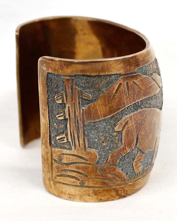 Native American Navajo Copper Storyteller Bracelet by Elaine Becenti, inside measures 7'' which includes the opening x 2''W, hallmarked B, 98.1gtw