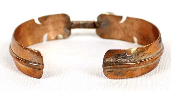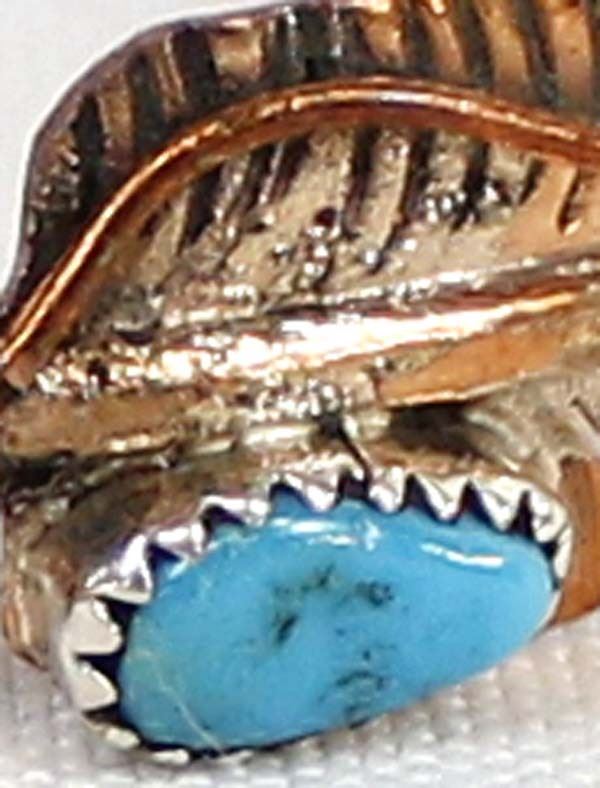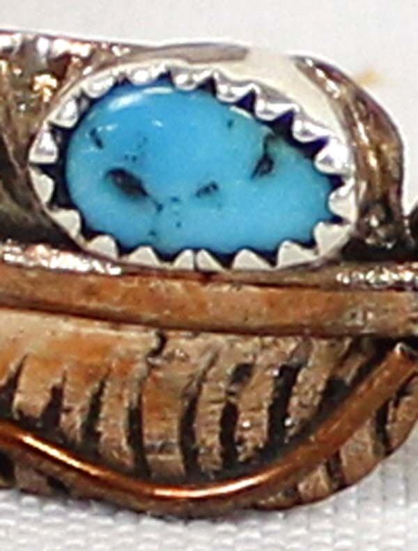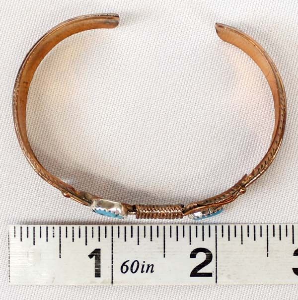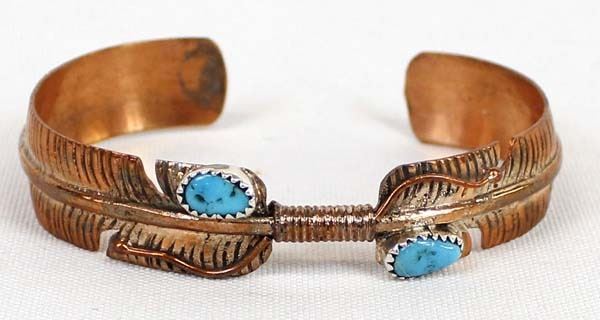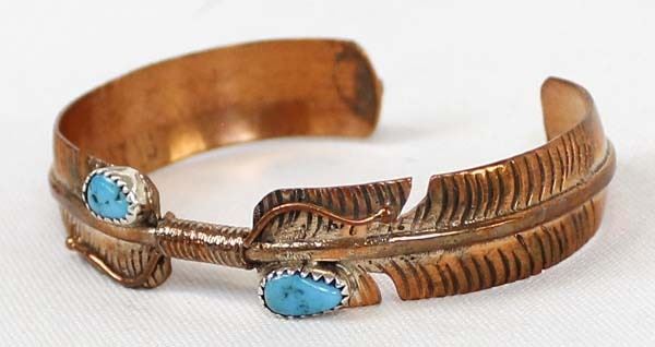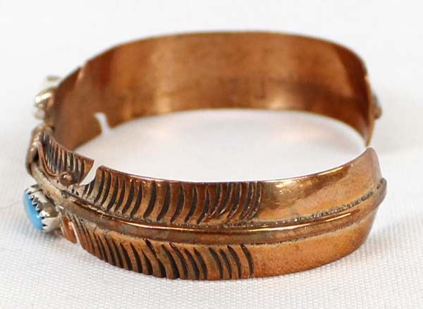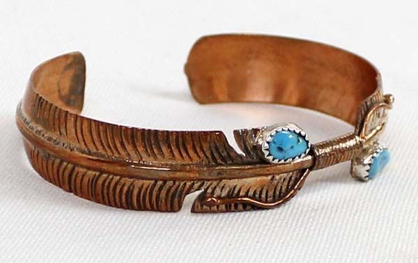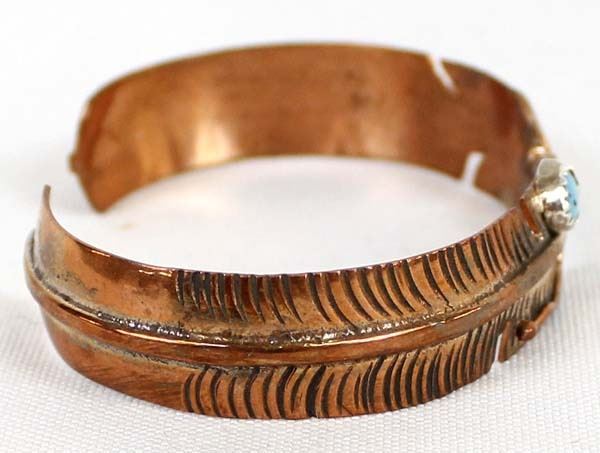 Native American Navajo Copper and Turquoise Feather Bracelet, inside measures 6.25'' which includes the gap x .5''W, artist's initials TB on the back