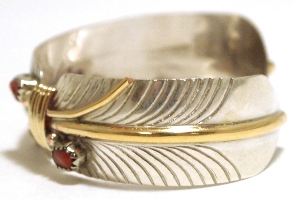 Navajo Coral & 12k Gold Fill over Sterling Silver Feather Cuff Bracelet - Virgil Reader