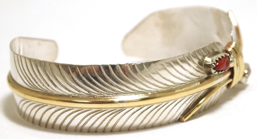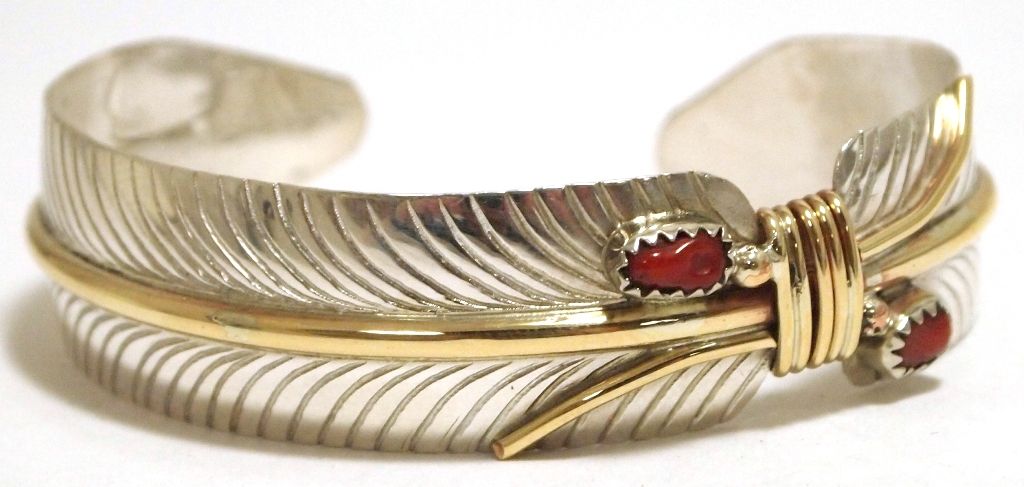 Navajo Coral & 12k Gold Fill over Sterling Silver Feather Cuff Bracelet - Virgil Reader