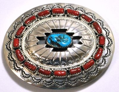 Navajo Coral & Turquoise Cluster Sterling Silver Buckle - Wilbert Muskett, Sr.