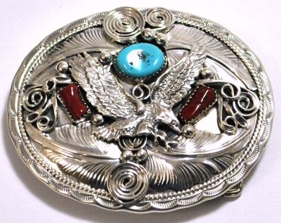 Navajo Coral & Turquoise Sterling Silver Flying Bird Buckle - Allen Chee