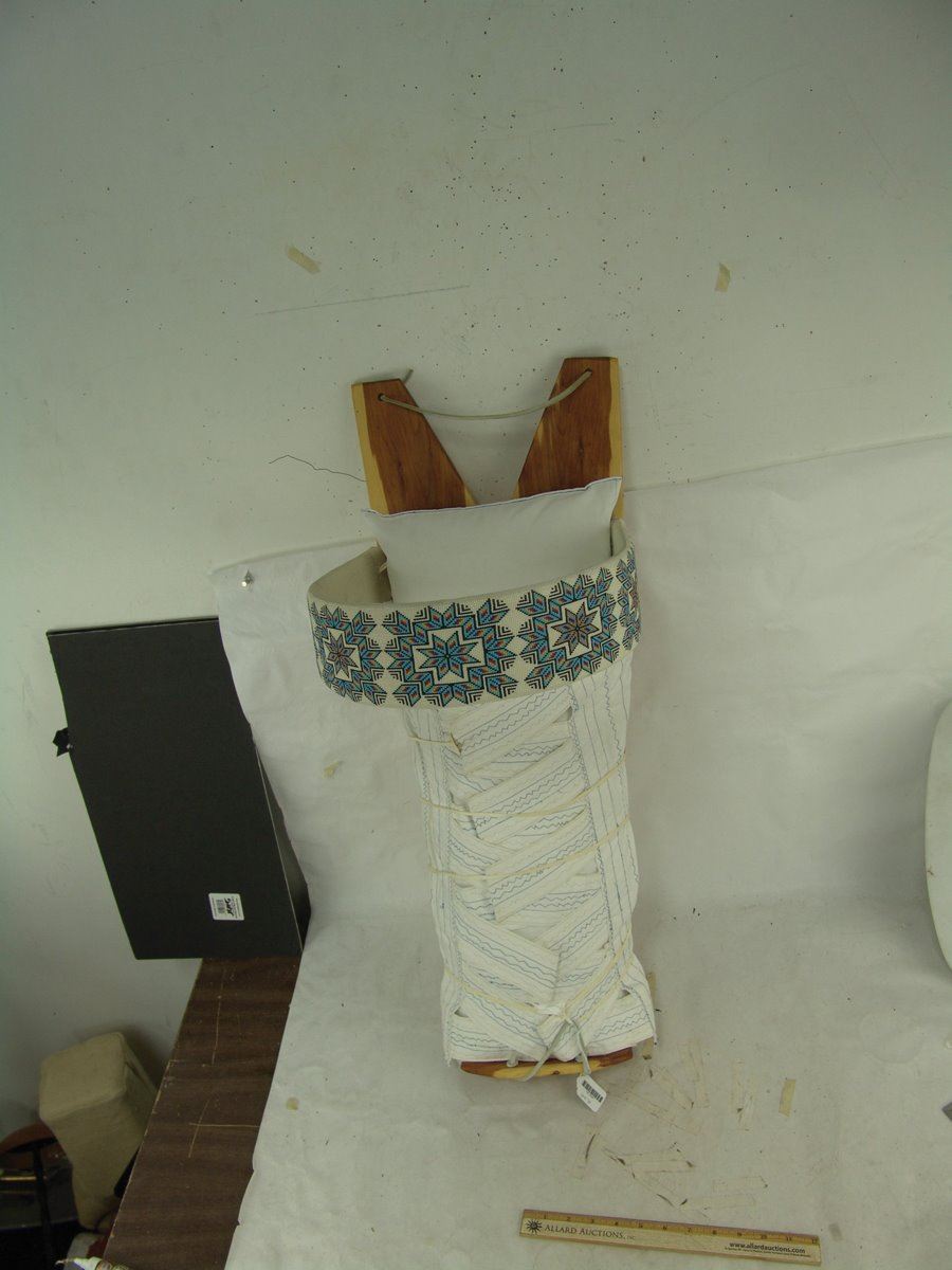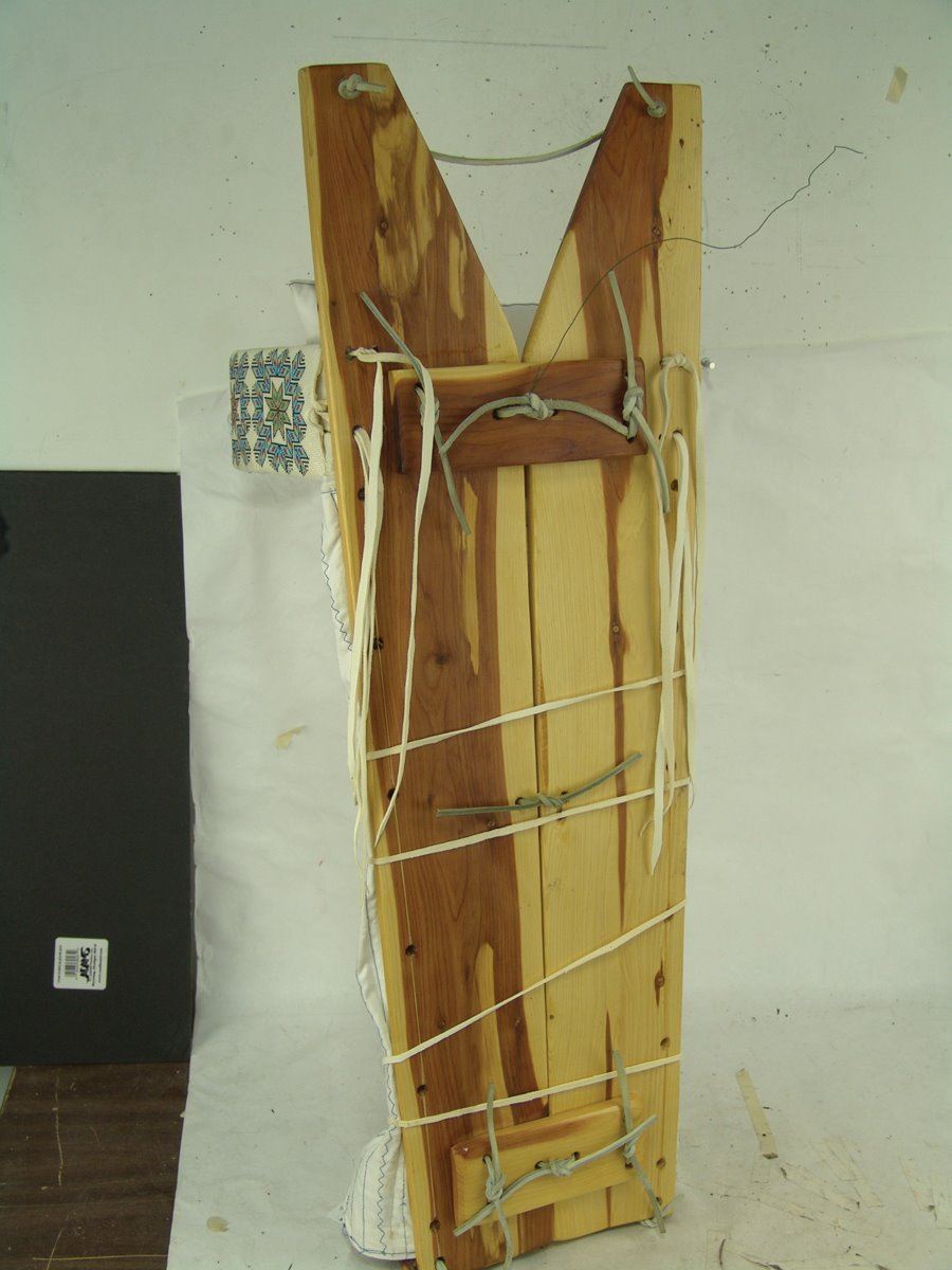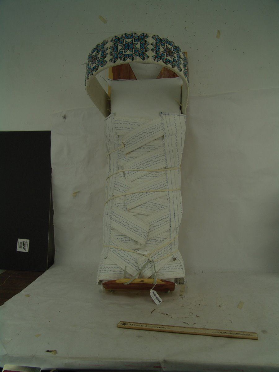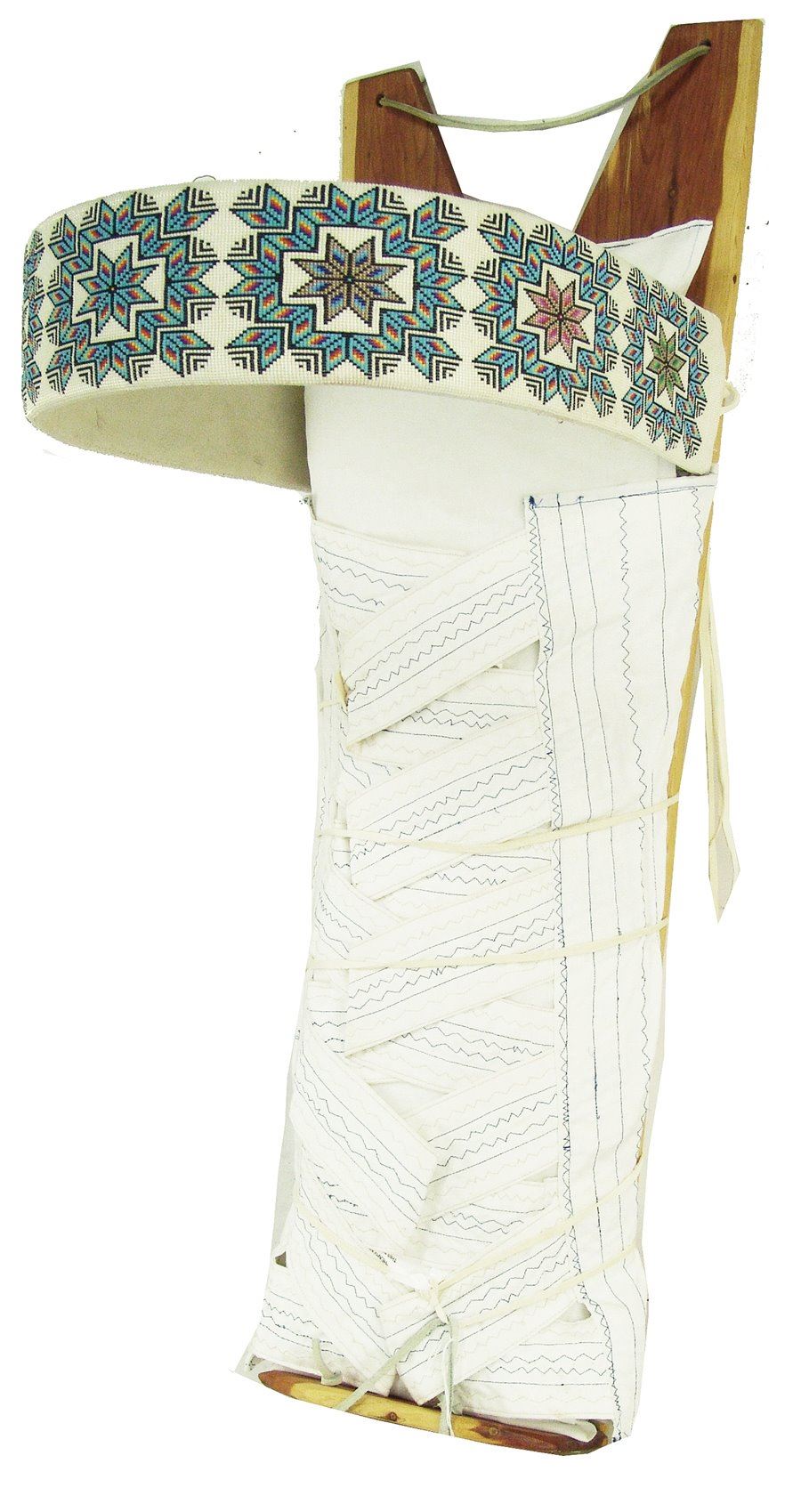 Classic design full sized baby carrier with juniper boards, and a quilted cloth body and wide loom beaded band with striking geometric design. Very good condition.,Ca. 1980s,32"