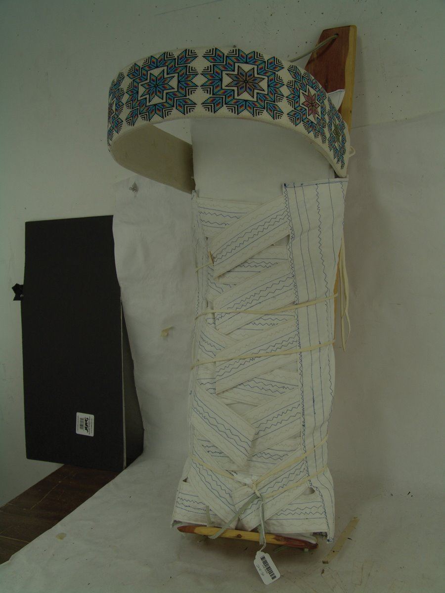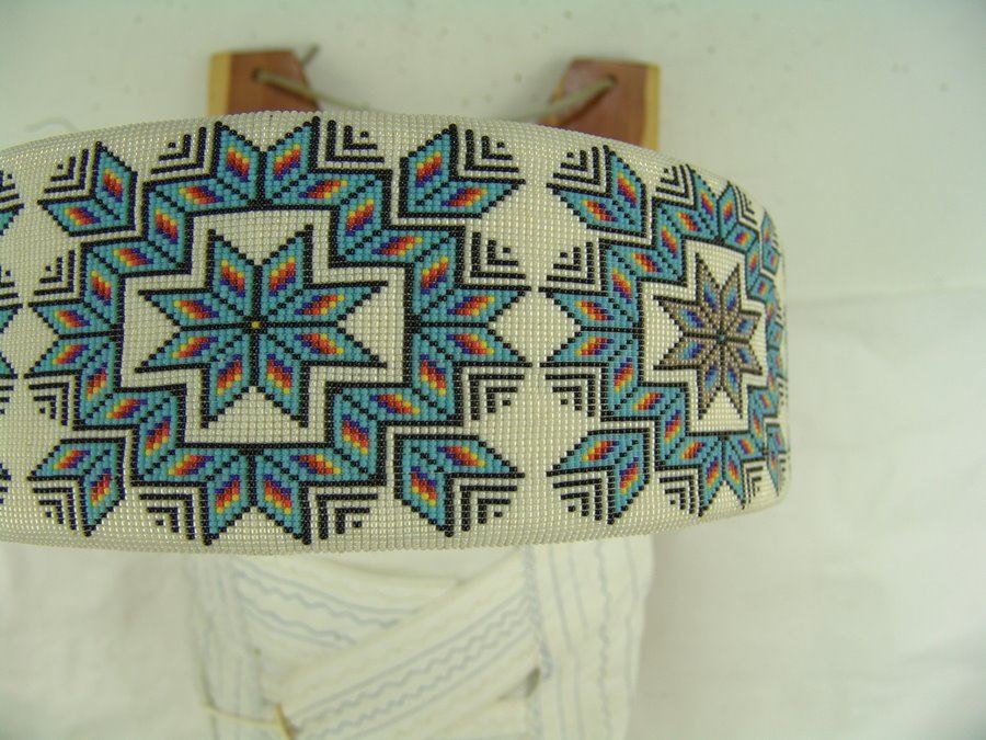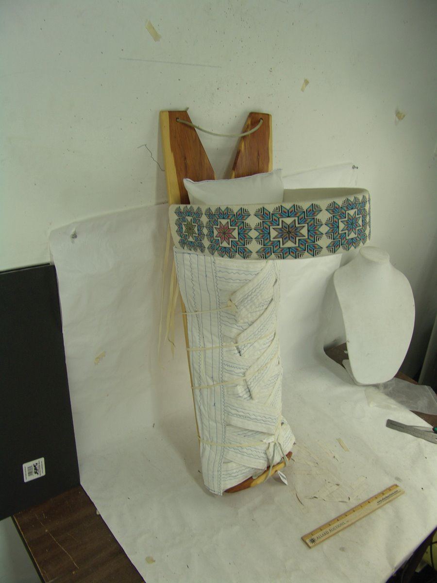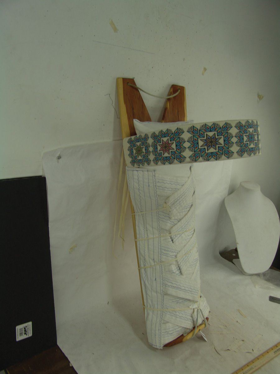 Classic design full sized baby carrier with juniper boards, and a quilted cloth body and wide loom beaded band with striking geometric design. Very good condition.,Ca. 1980s,32"