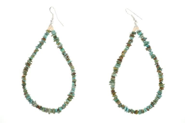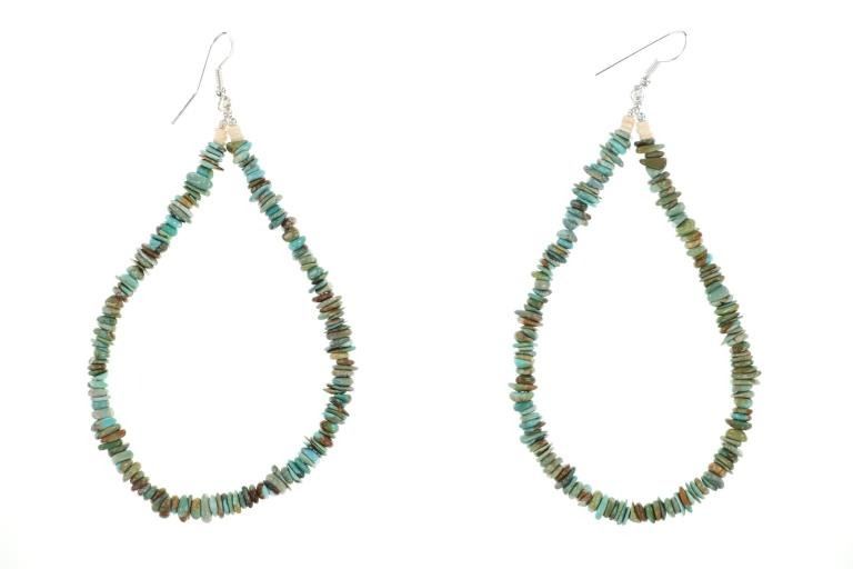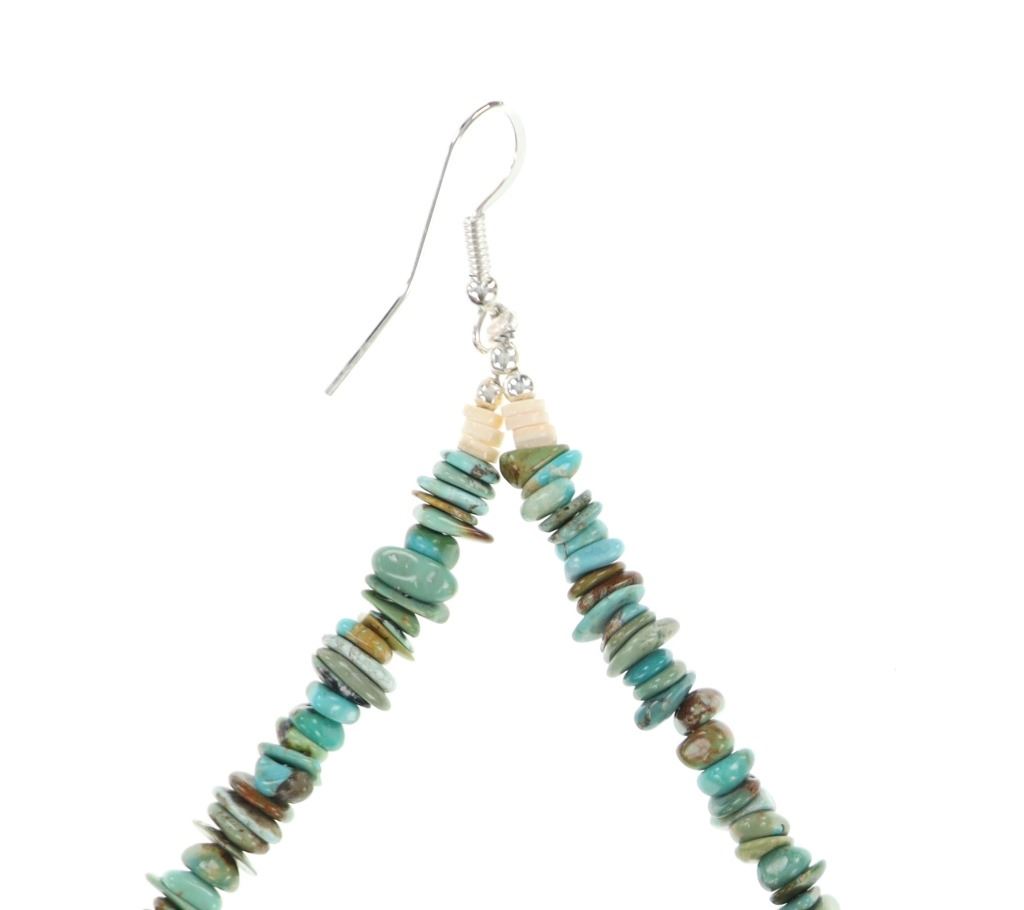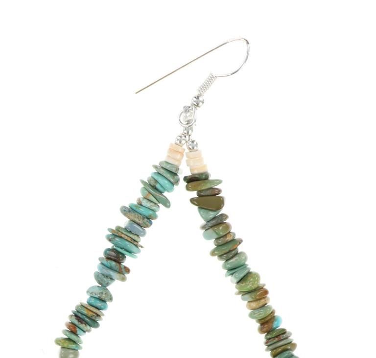 Featured in this lot is this Navajo cripple creek turquoise and heishi earrings. The earrings feature a wonderfully and professionally crafted cripple creek turquoise and heshi bead construction that is strung in large hoops with a sterling silver hook backing. The condition of this pair of Navajo earrings is good with no obvious signs of damage and shows good overall condition. The measurements of this pair of earrings is 4 1/4" x 2". The collective weight of this pair of earrings is 14.4g.