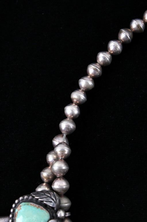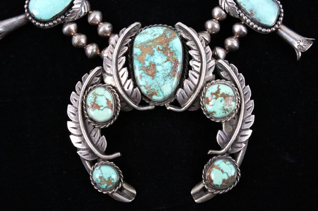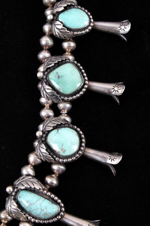Included in this lot is a gorgeous Navajo Native American Squash Blossom necklace featuring a stunning array of Cripple Creek turquoise gemstones. The necklace features a dual band strand construction with each strand strung with six blossoms of Cripple Creek turquoise polished gemstones. Each blossom has a sterling floral accent and hand stamped sun design on the blossom. The necklace has a hook and eye clasp. The stunning and large Naja on this necklace features a large Cripple Creek turquoise gemstone and four additional gemstones. The Naja also showcases some beautiful craftsmanship incorporating floral silver accents. The Naja measures 3 ¼” x 3 ¼” while the necklace measures approximately 29” long when unclasped.