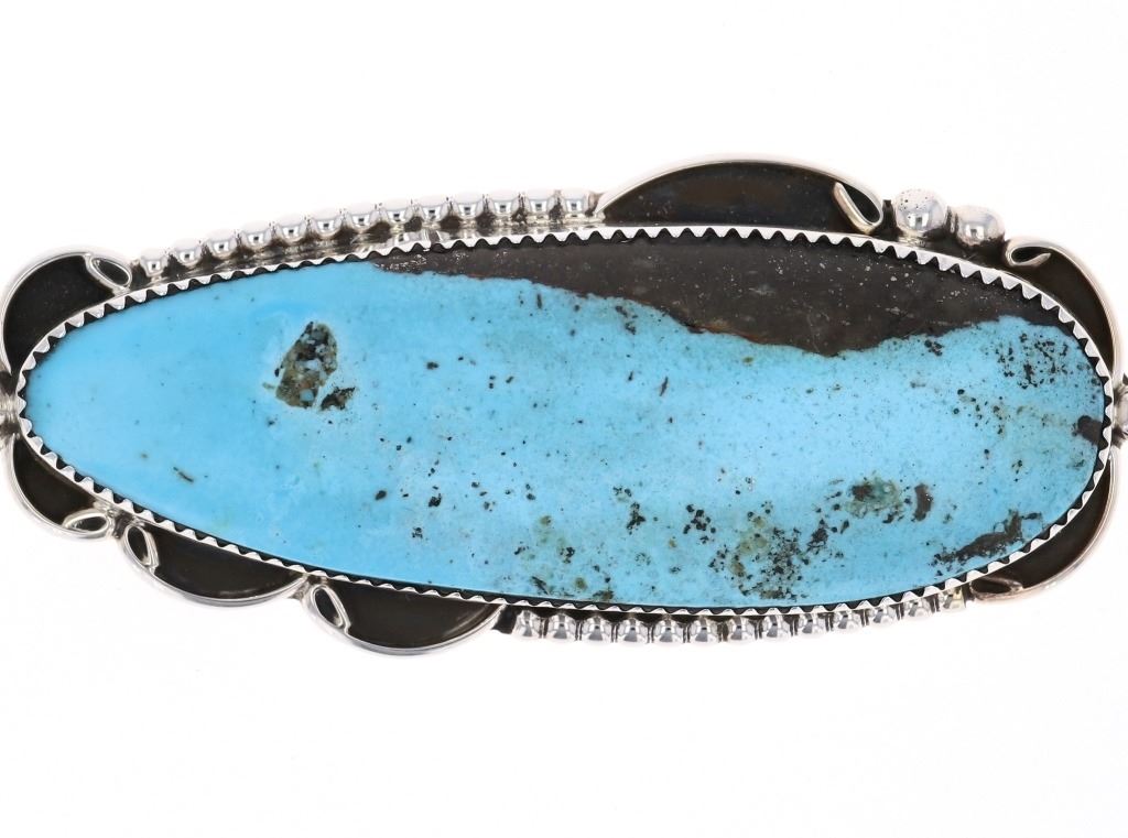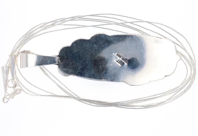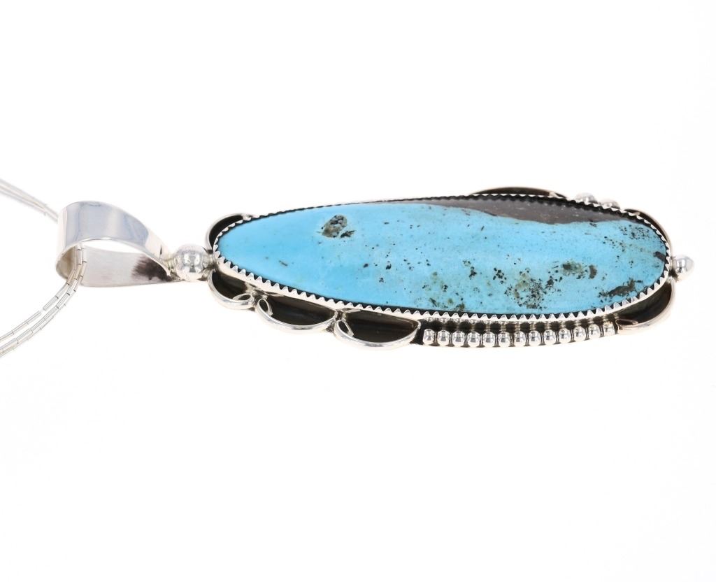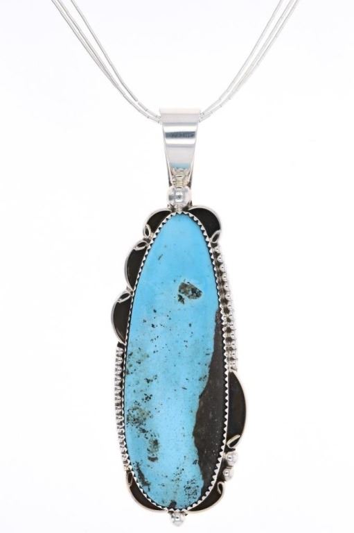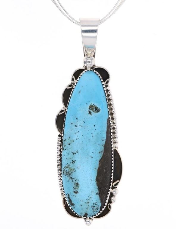 For your consideration is this amazing Cripple Creek turquoise pendant set in sterling on a liquid sterling necklace from Navajo silversmith Bernadine Begay Tsosie. The back of the large Cripple Creek turquoise oval cut cabochon is signed, "BBT Sterling" and shows a nice half shadow box, half beaded border on the pendant. The pendant is set on a three strand liquid sterling necklace. The necklace is in good condition with no signs of damage or wear. The pendant measures 2 1/2" L x 1" W and the necklace from clasp to clasp measures 20" L. The necklace weighs 27.4 grams.