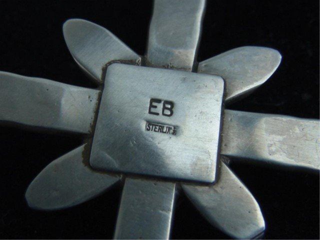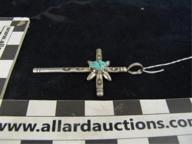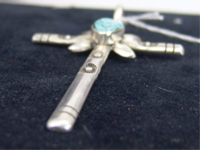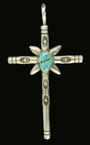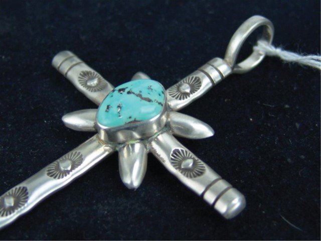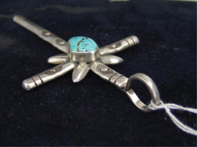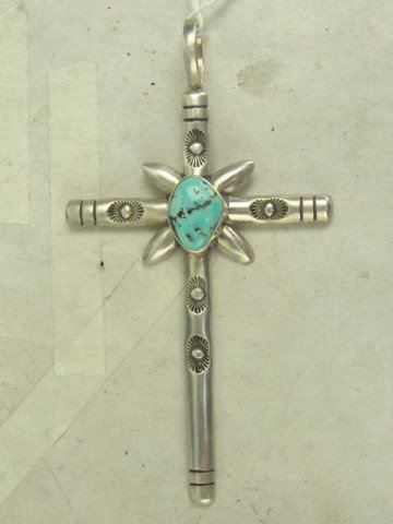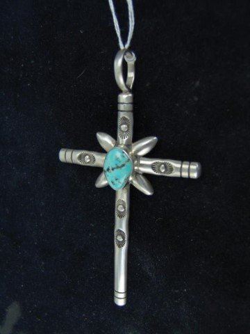 Late 1900s Wonderful bench made solid silver cross with beautiful stamped accents, bale on top, and single black matrix turquoise stone. Excellent condition. 4-1/2" x 2-3/4"