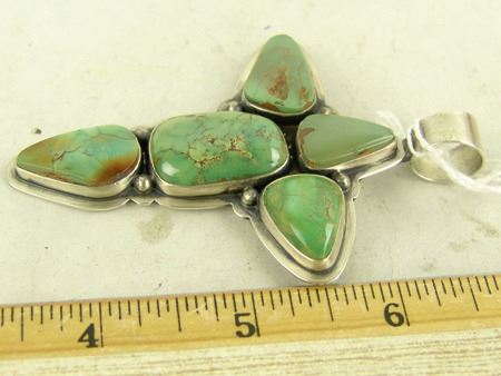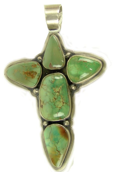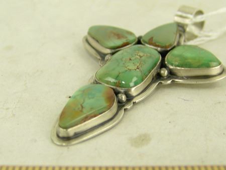 Late 1900s, Beautiful five-stone all-silver cross pendant made with matching green Damele {?} turquoise. Very good condition. 3" x 2"