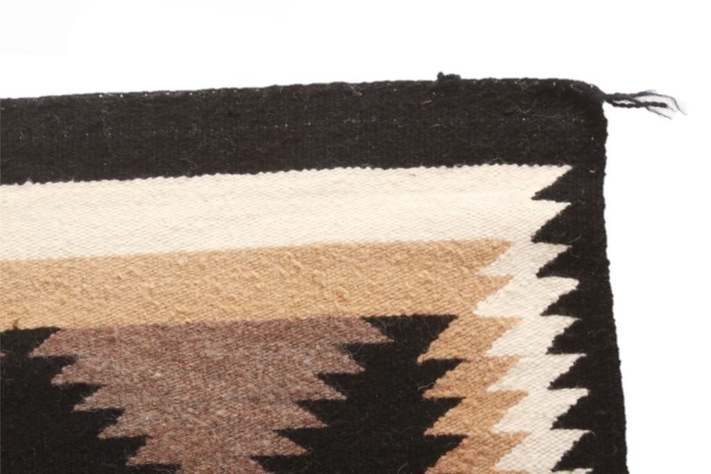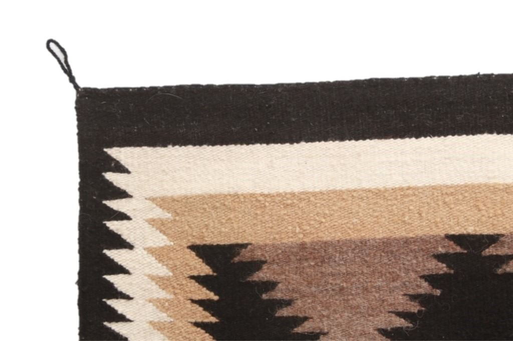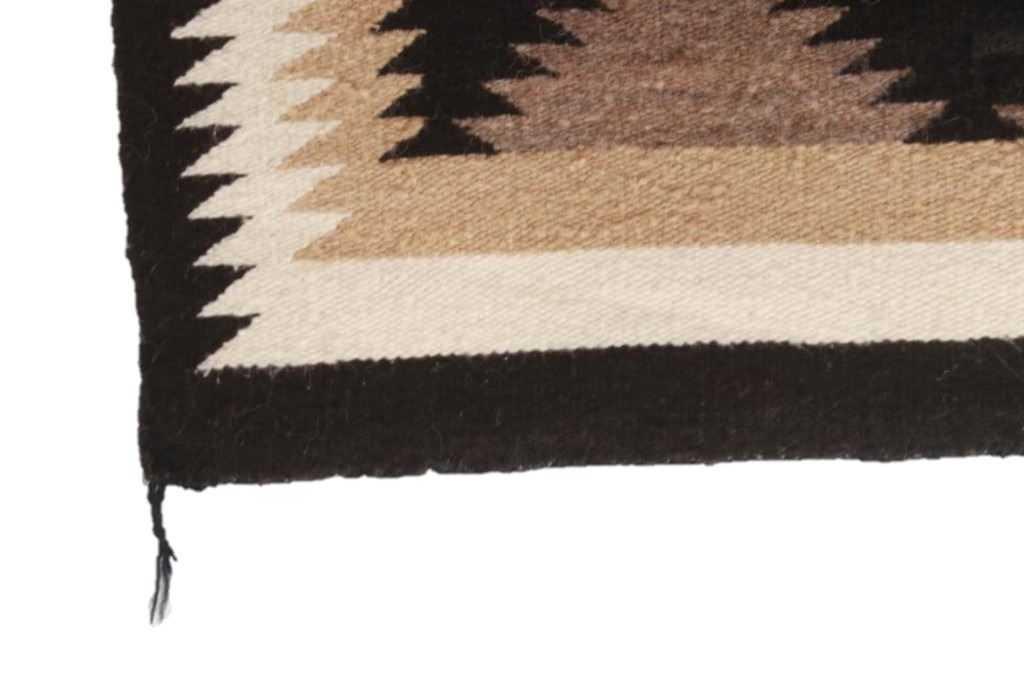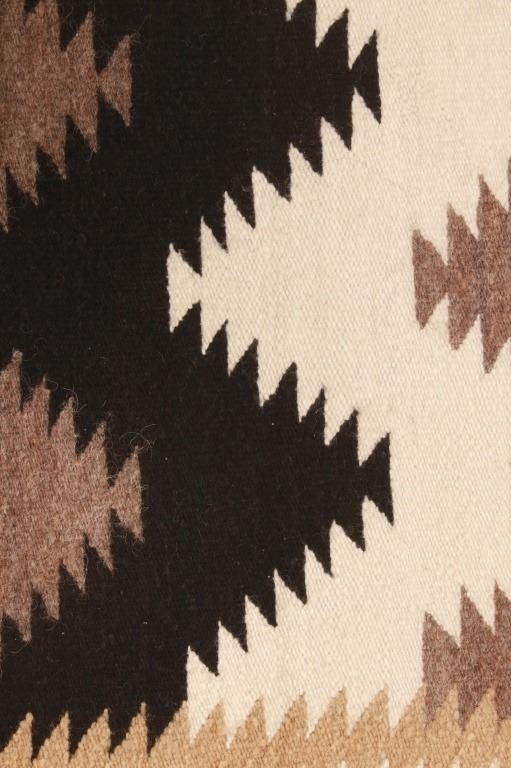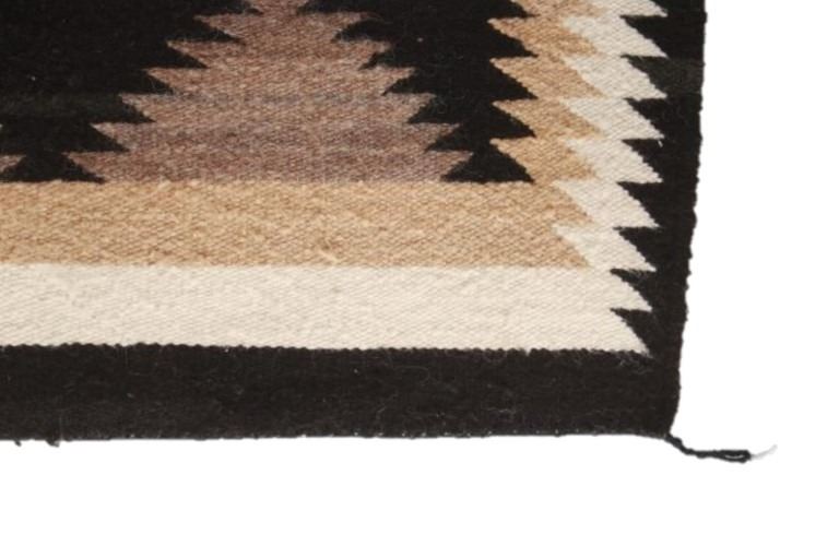 Featured in this lot is this Navajo crystal eye dazzler hand woven rug c. 1940's. This rug shows a beautiful design of traditional eye dazzler decoration with a black border and eye dazzler design with coloration of light brown, off white, brown and black. Originally, the Old Crystal trading post was established in 1894 in a remote part of the Navajo Reservation, southwest of Two Grey Hills and northwest of Gallup. In 1896, J.B. Moore purchased an interest in the trading post and re-named it Crystal after a pure sparkling mountain spring that was in the area. Due to the remoteness of the Trading Post, he started using a mail order catalog to sell his rugs to the Eastern market. The first catalog came out in 1903, with another in 1911. He left the reservation in 1911. During his stay at Crystal, he greatly influenced the change in styles of Navajo rugs produced at the Crystal Trading Post. The condition of this rug is good with no obvious signs of damage and in good overall condition. The measurements of this rug are 48 1/2" x 34".